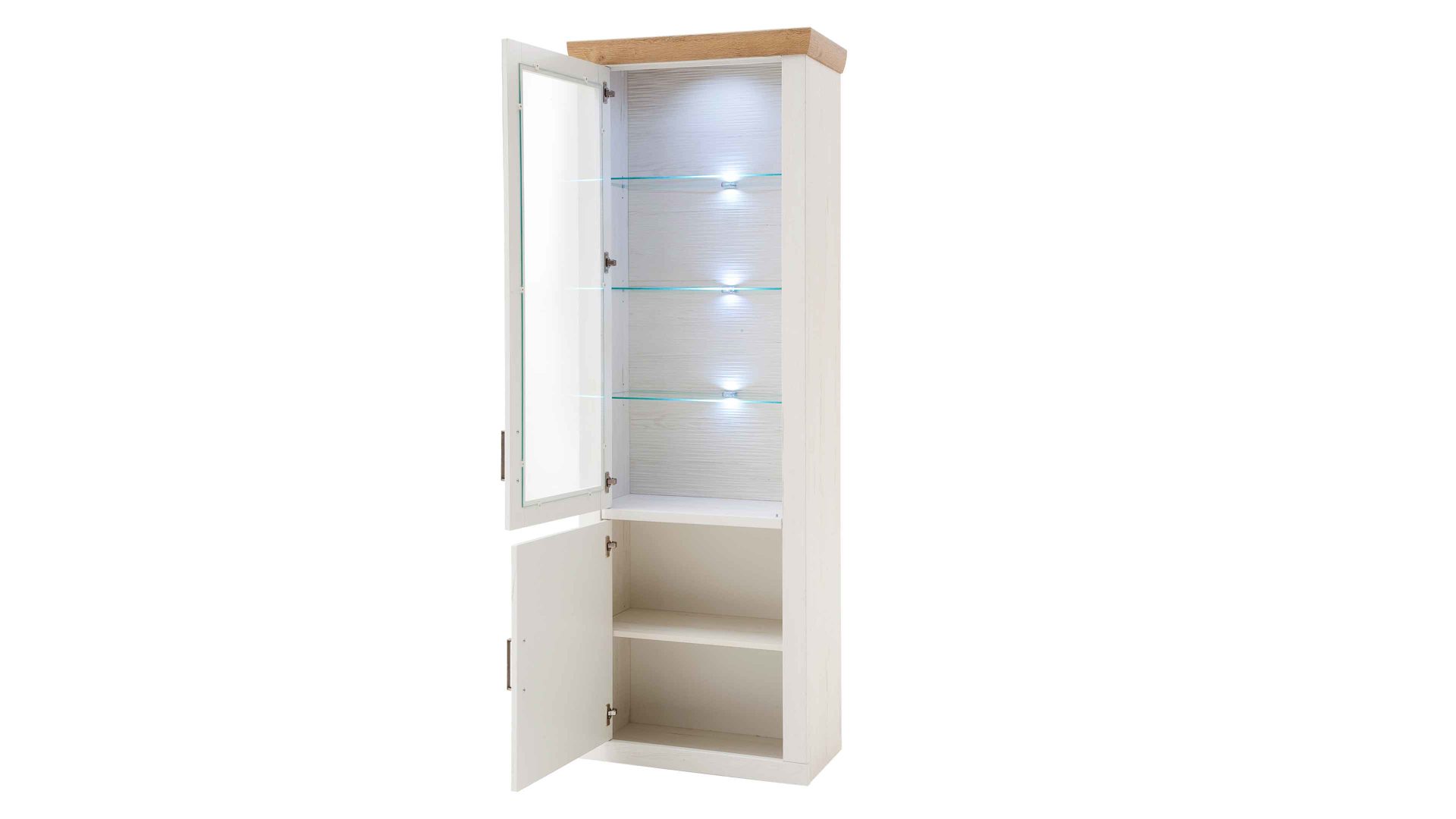 Funktionale Höhepunkte sind die kratz- und stoßfesten Melaminoberflächen. Optional lässt sich die Einzelvitrine auch mit einer bezaubernden LED-Beleuchtung ergänzen. Zum hochwertigen und attraktiven Wohnprogramm Brixen gehören noch zahlreiche weitere Wohnmöbel im gleichen oder ähnlichen Design, sodass Sie Ihre Wohnzimmereinrichtung individuell zusammenstellen können.