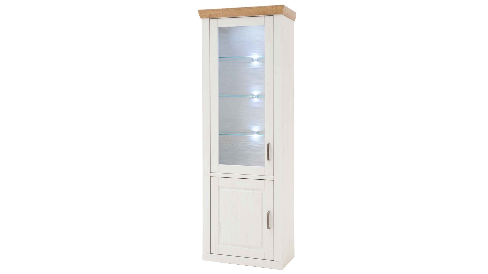 Bei der Vitrine 10 aus dem Wohnprogramm Brixen begeistern sowohl die optischen als auch die funktionalen Merkmale. Sie kombiniert Pinie Aurelio-Nachbildung mit Grandson Oak-Nachbildung. Durch die Farben und die spezielle Frontgestaltung erscheint das Wohnmöbel im angesagten skandinavischen Landhausstil. Eine geschroppte Rückwand, die ebenfalls in Pinie Aurelio-Nachbildung gehalten ist, sorgt zusammen mit dem Klarglaseinsatz für weitere herausragende Akzente. Klassische Metallgriffe runden das ausdrucksstarke Design stilvoll ab.