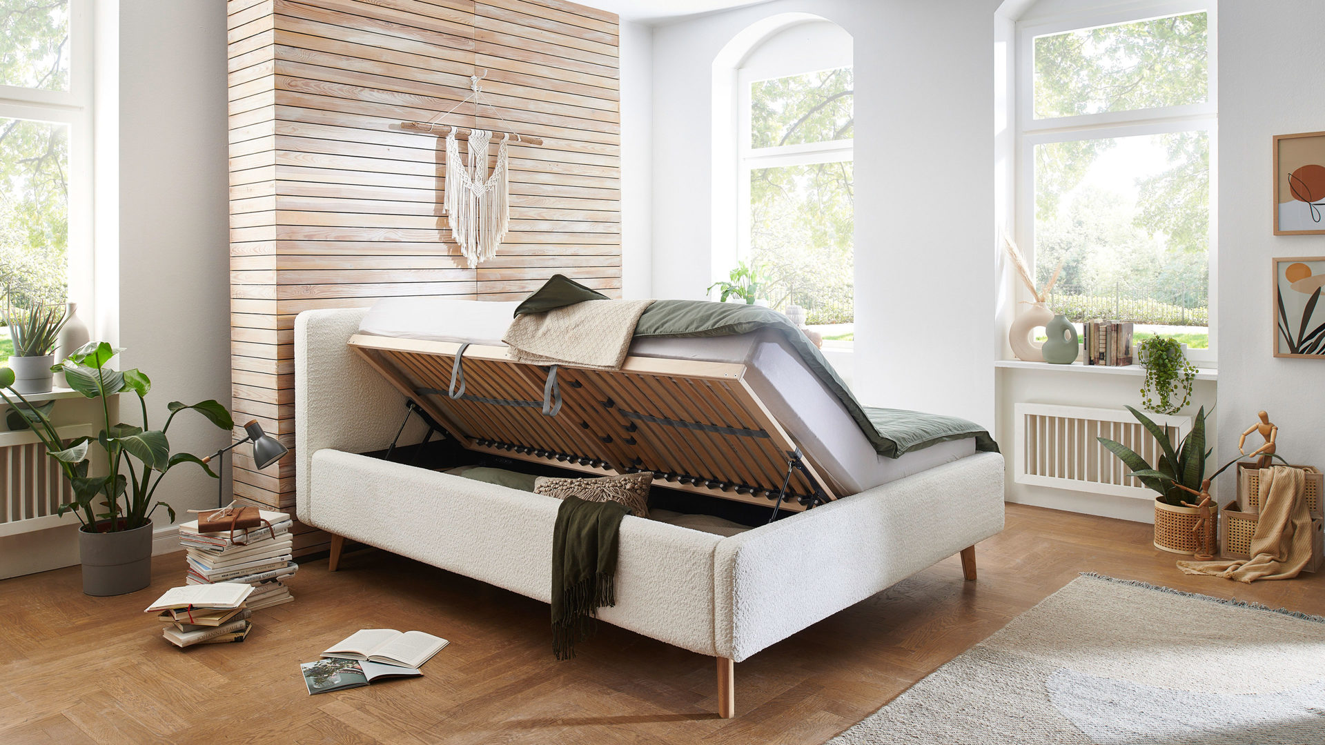 Im Lieferumfang des Bettgestells sind zwei hochwertige Lattenrahmen enthalten, die jeweils 28 Federholzleisten mit Härtegradverstellung aufweisen. Klappen Sie die Lattenrahmen seitlich hoch, um sich Zugang zu den Bettkästen mit Gasdruckdämpfer zu verschaffen. In den geräumigen Kästen können Sie etwa Bettzubehör wie Kissen und Decken sowie viele sonstige Utensilien praktisch platzsparend aufbewahren.