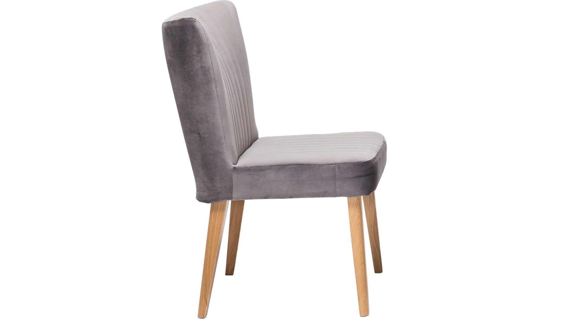 Dieser hochwertige Polsterstuhl mit grauem Bezug hat einen modernen Samtlook und ist damit ein klassisches Sitzmöbel. Eine zusätzlich interessante Optik verleihen dem Esszimmermöbel seine aufwendigen Steppnähte, die auf Sitz und Rücken angebracht sind. Zu mehreren passt der Polsterstuhl mit den Maßen von ca. 46 x 92 x 66 cm (BxHxT) optimal an einen Esstisch aus Eiche, denn das Holzgestell besteht ebenfalls aus Eiche natur.