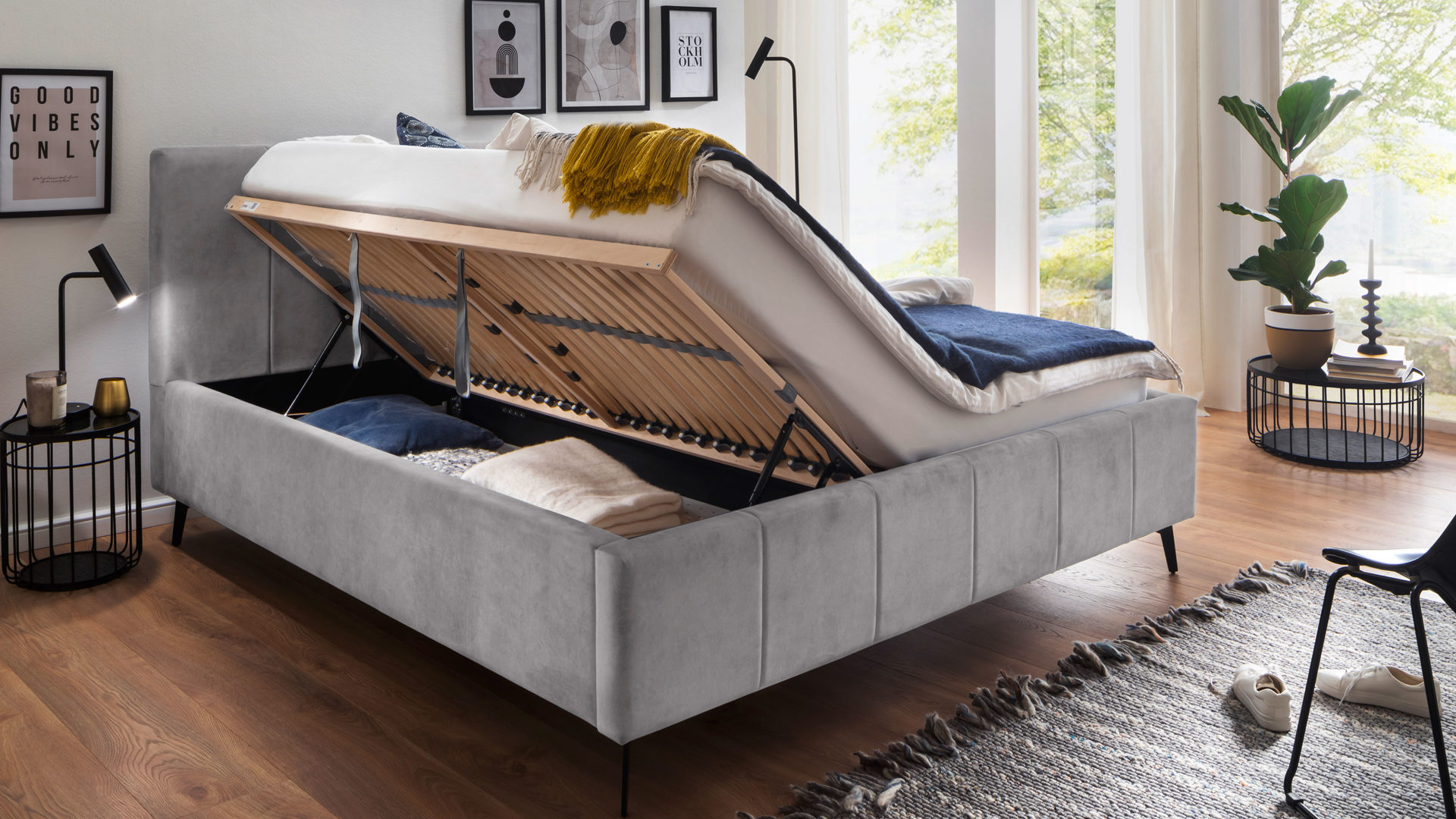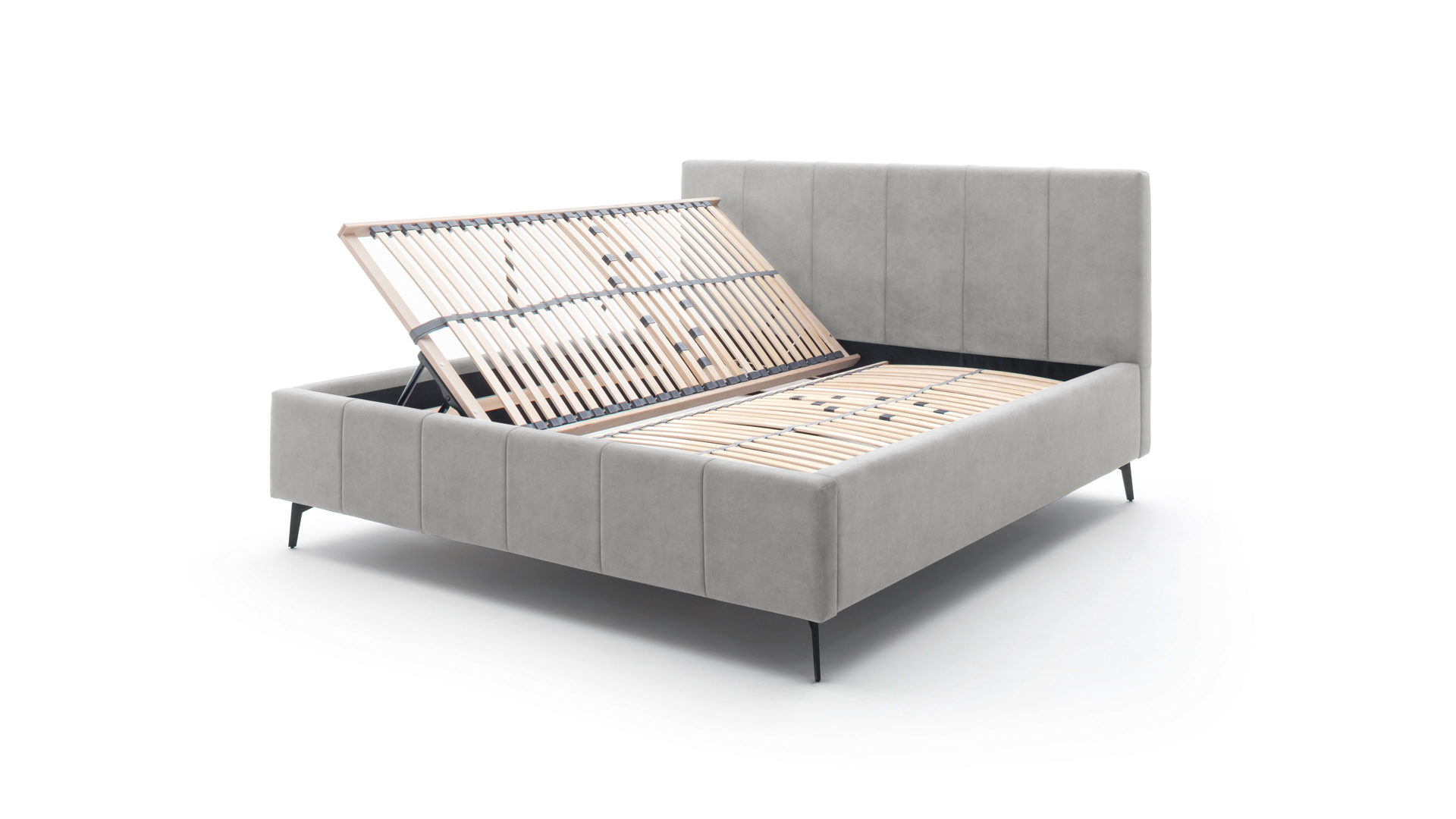 Unter einem seitlich zu öffnenden Federholzrahmen liegt ein geteilter und belüfteter Bettkasten. Der Lattenrost bringt 28 starre Leisten mit. Dank individueller Härtegradverstellung liegen Sie immer genau richtig: etwas weicher oder nach Belieben etwas fester gestützt.
