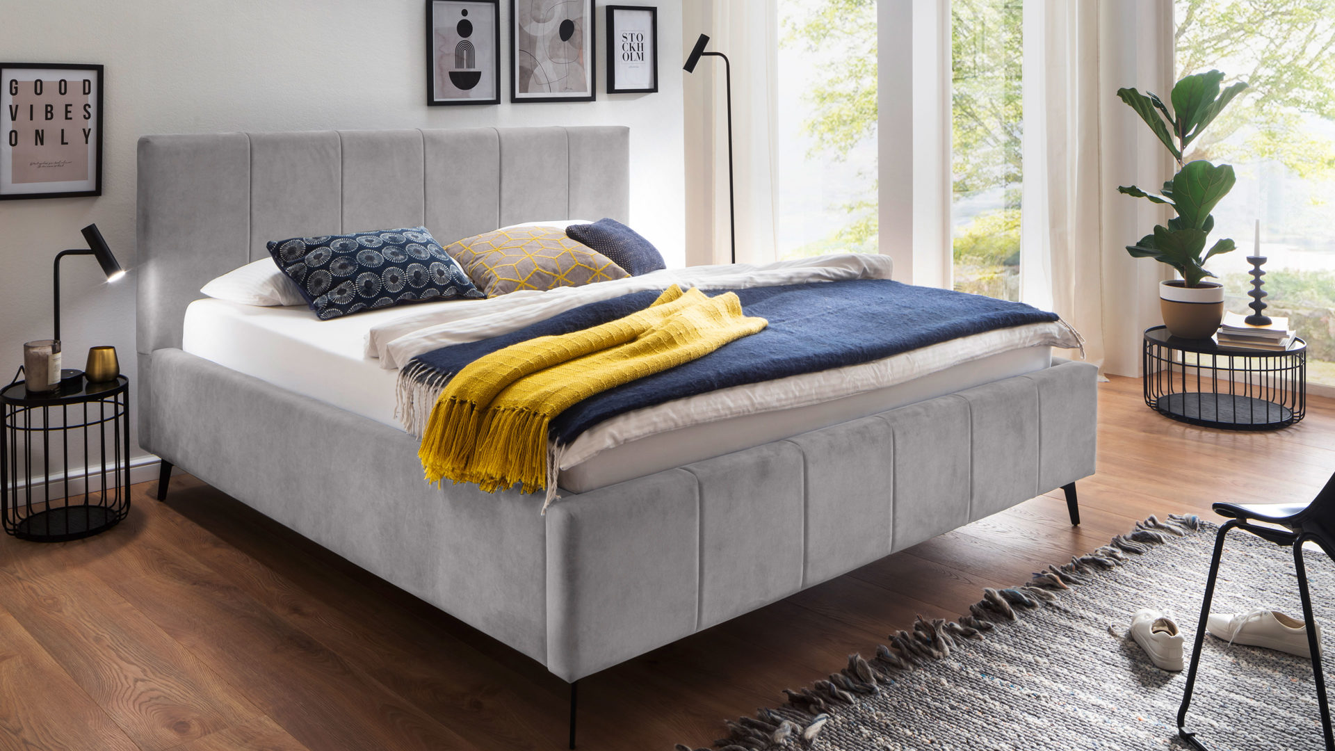 Das Polsterbettgestell Lizzano kommt im zeitlos schicken Design. Von den filigranen, schwarz lackierten Metallfüßen bis hin zum hellgrauen Samtbezug Cloud 81 strahlt das Bett eine dezente Eleganz aus. Damit passt es in nahezu jedes Interieur: Mit einer romantisch angehauchten Schlafzimmereinrichtung harmoniert es ebenso wie mit geradlinigem Minimalismus.