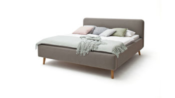 Das Polsterbettgestell Mattis begeistert durch die elegante Optik sowie die hervorragende Material- und Verarbeitungsqualität. Es kombiniert einen taupefarbenen Flachgewebe-Bezug mit eichefarbenen Holzfüßen. Sowohl die Bettseiten als auch das Polsterkopfteil sind glatt bezogen. Letzteres lädt Sie ein, sich anzulehnen, wenn Sie abends im Bett vor dem Schlafen noch fernsehen oder in einem Buch lesen.