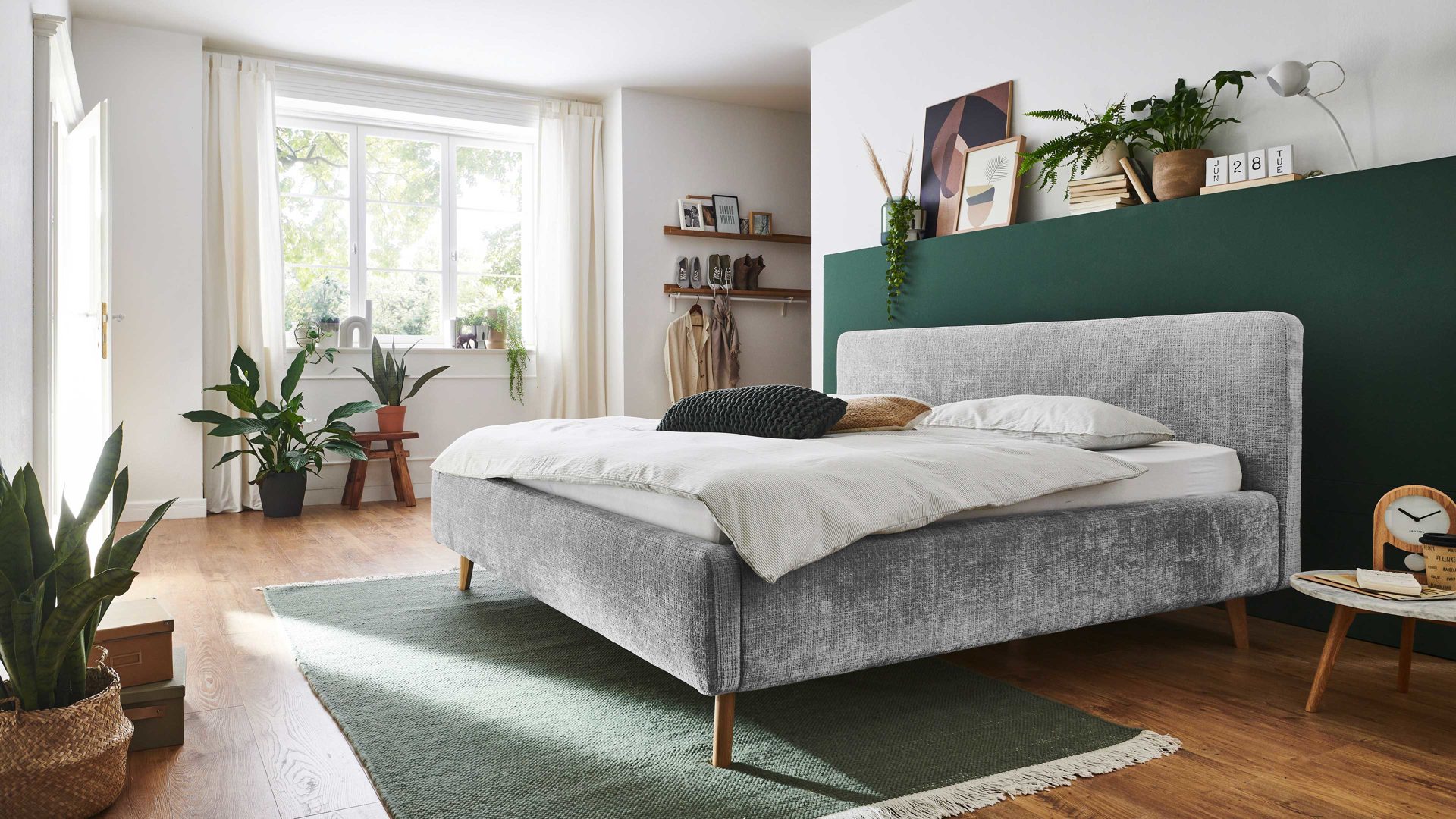 Das Polsterbettgestell Mattis begeistert durch die elegante Optik sowie die hervorragende Material- und Verarbeitungsqualität. Es kombiniert einen grauen Chenille-Bezug mit eichefarbenen Holzfüßen. Sowohl die Bettseiten als auch das Polsterkopfteil sind glatt bezogen. Letzteres lädt Sie ein, sich anzulehnen, wenn Sie abends im Bett vor dem Schlafen noch fernsehen oder in einem Buch lesen.