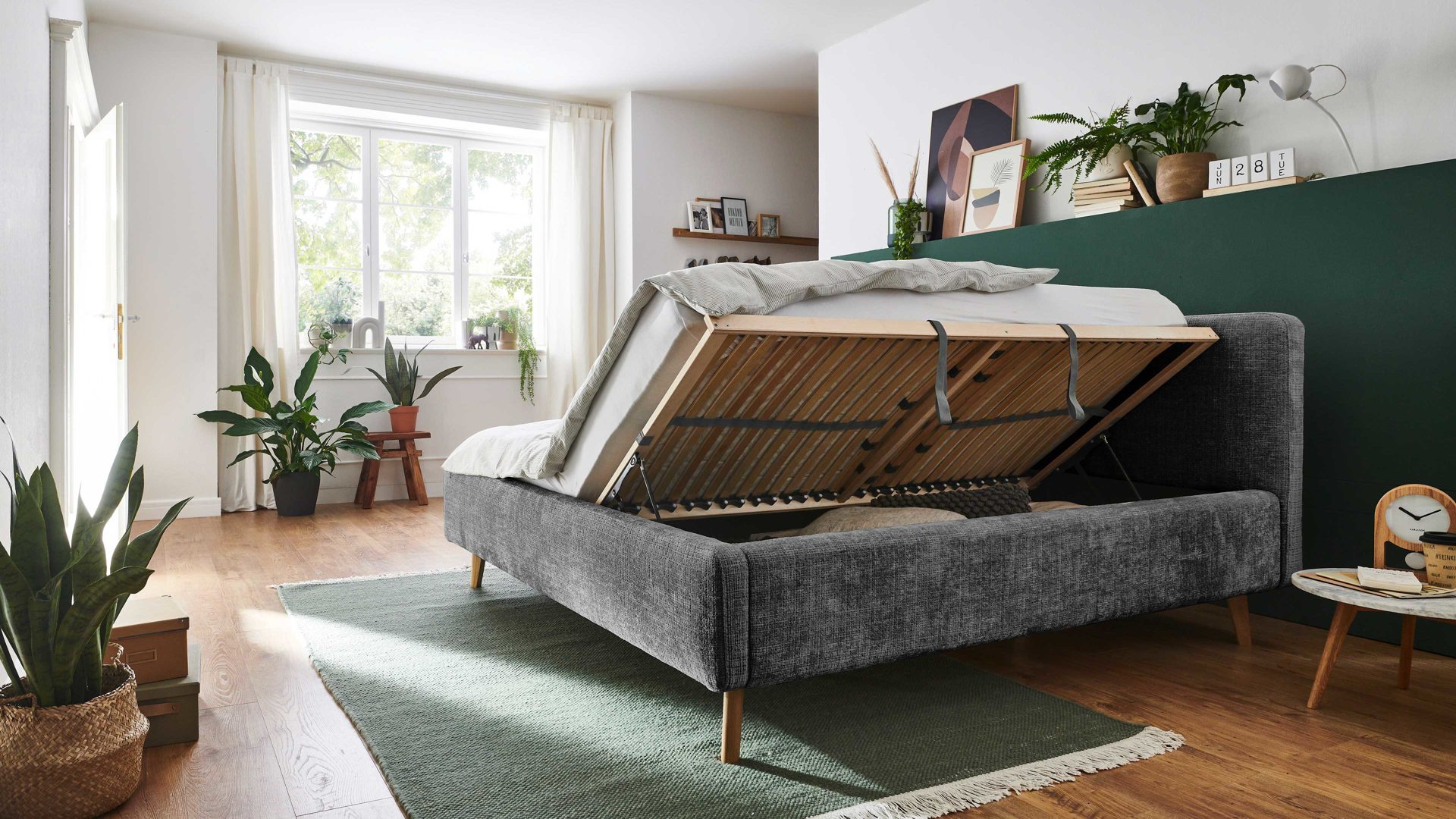 Im Lieferumfang des Bettgestells sind zwei hochwertige Lattenrahmen enthalten, die jeweils 28 Federholzleisten mit Härtegradverstellung aufweisen. Klappen Sie die Lattenrahmen seitlich hoch, um sich Zugang zu den Bettkästen mit Gasdruckdämpfer zu verschaffen. In den geräumigen Kästen können Sie etwa Bettzubehör wie Kissen und Decken sowie viele sonstige Utensilien praktisch platzsparend aufbewahren.