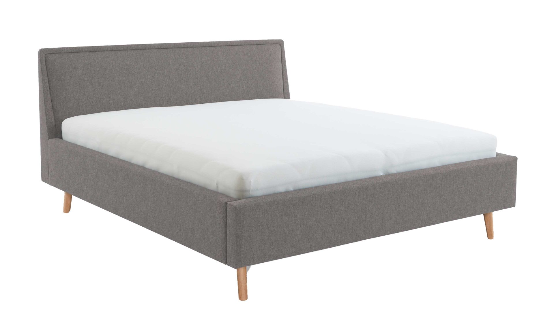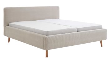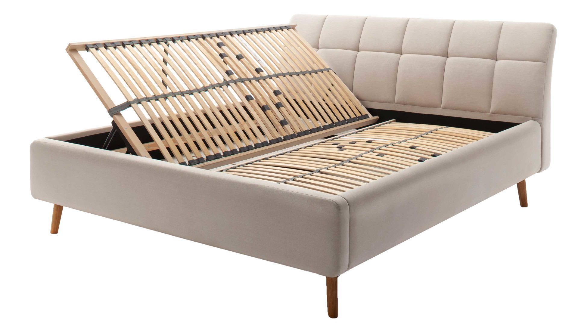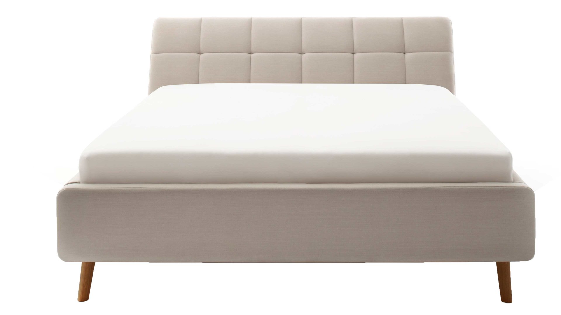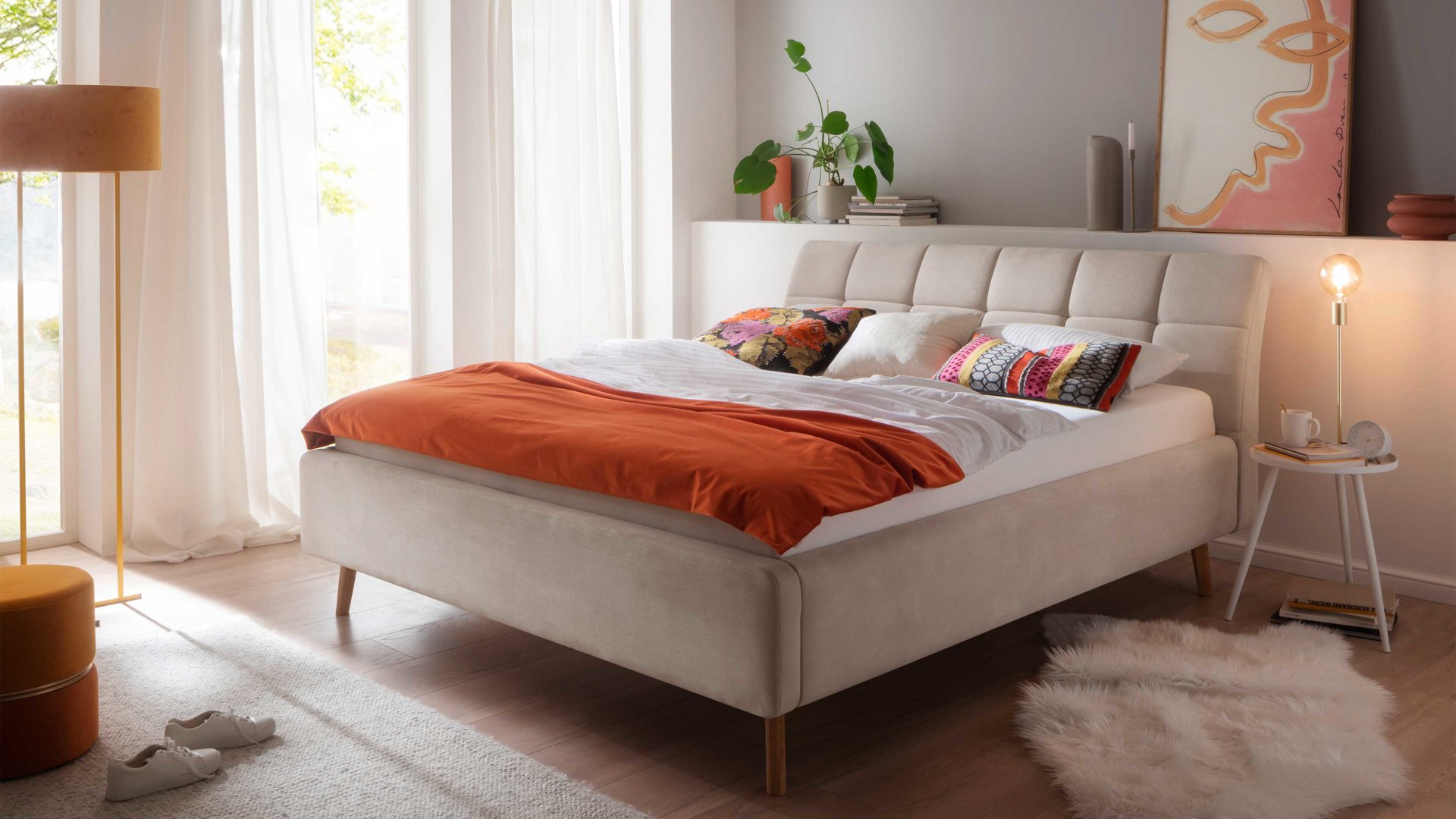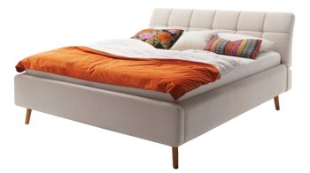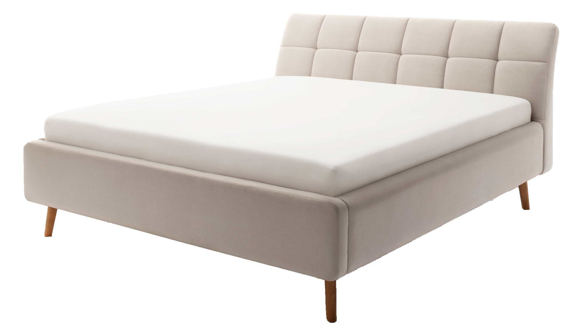 Pure Eleganz bringt das Polsterbettgestell Mila in Ihr Schlafzimmer. Die eichefarbenen Füße wirken filigran und verleihen diesem Modell eine luftig leichte Ausstrahlung. Ausgestattet ist das schicke Bett mit dem Bezug Capri 3723 aus beigem Flachgewebe.