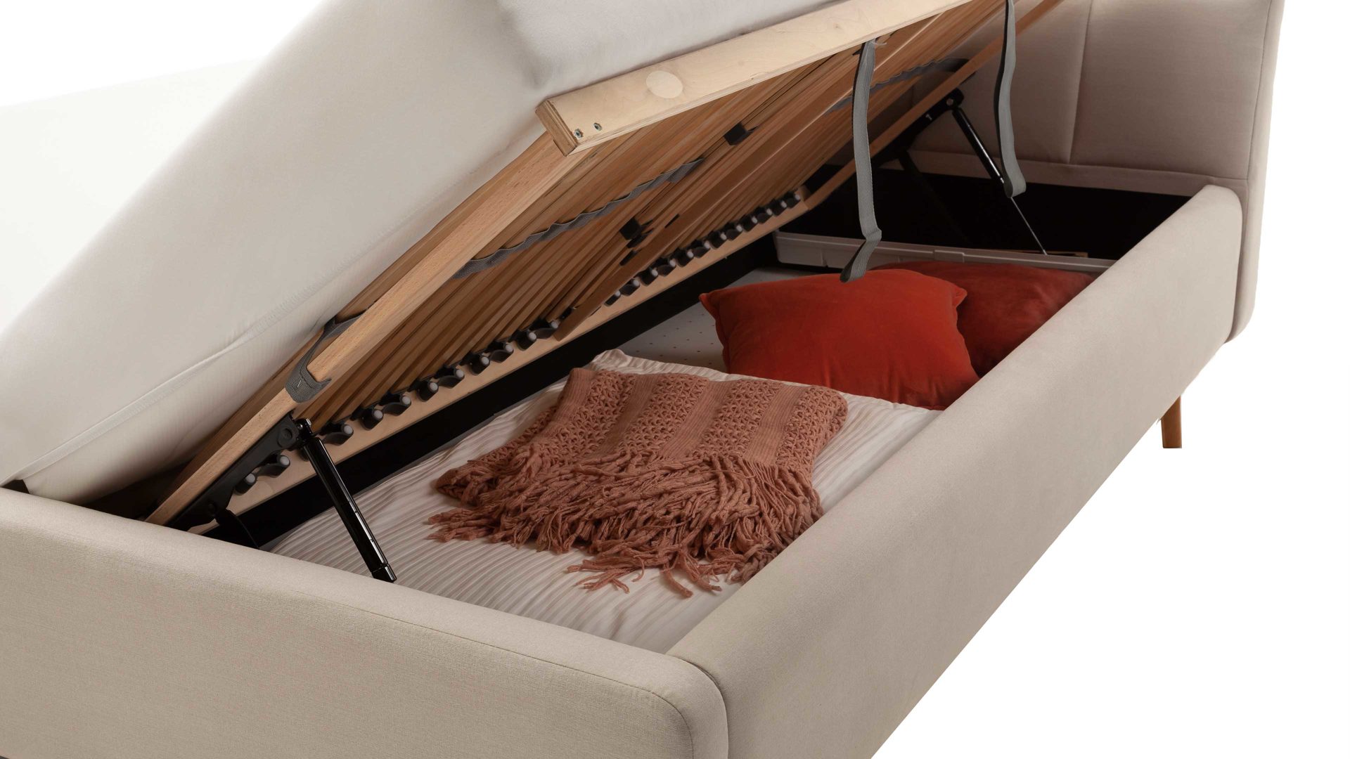 Im Inneren liegen zwei jeweils seitlich zu öffnende Federholzrahmen mit 28 starren Leisten. Dank der möglichen Härtegradverstellung liegen Sie immer genau richtig. Der integrierte Bettkasten ist belüftet und geteilt - für eine Extramaß an Ordnung und Stauraum bei dennoch optimaler Luftzirkulation.