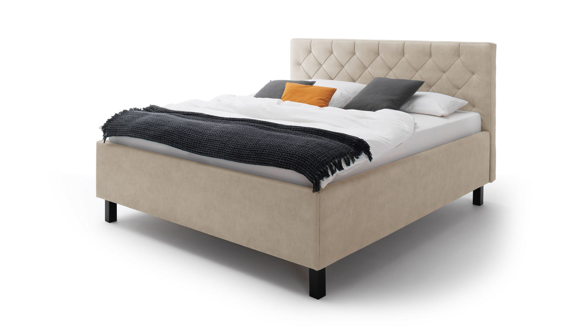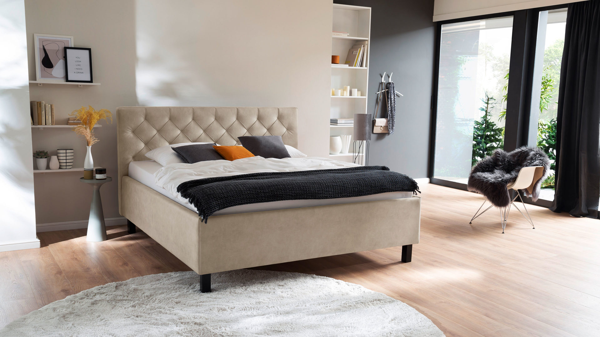 Das Polsterbettgestell San Remo bringt einen zeitlosen Chic mit. Sein beiger Mikrofaserbezug Bulus 02 trifft auf Holzfüße in dezentem Schwarz. Abgerundet wird das edle Design von dem gesteppten Kopfteil mit Rautenmuster. Es entsteht ein stilvoller Look voll frischer Eleganz.