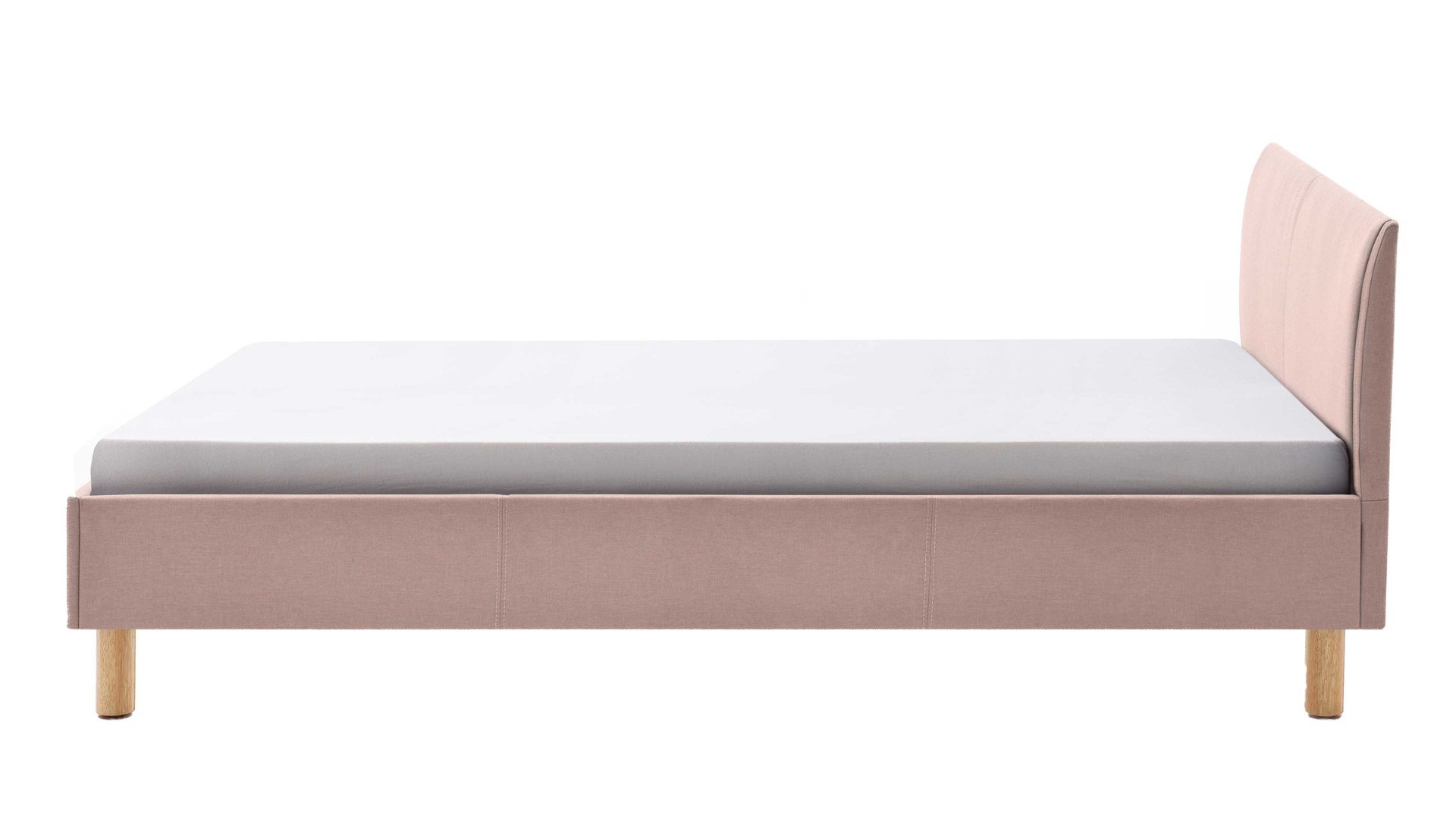 Mit dem edlen altrosafarbenen Stoffbezug und den eichefarbenen Holzfüßen strahlt das Polsterbettgestell Lena feminine Eleganz mit einer Prise Natürlichkeit aus. Sowohl die Bettseiten als auch das bequeme Polsterkopfteil sind glatt bezogen, was den gemütlichen Charakter des Bettes unterstreicht. Das angenehm weiche Kopfteil ist beispielsweise beim Lesen oder Fernsehen als praktische Rückenlehne nutzbar.
