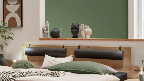 • Die Abbildung zeigt ein Wohnbeispiel, welches auch Dekoration sowie separat erhältliches Zubehör enthält. Im Lieferumfang enthalten sind ein Schwebetürenschrank, ein Bettgestell und zwei Hängekonsolen.