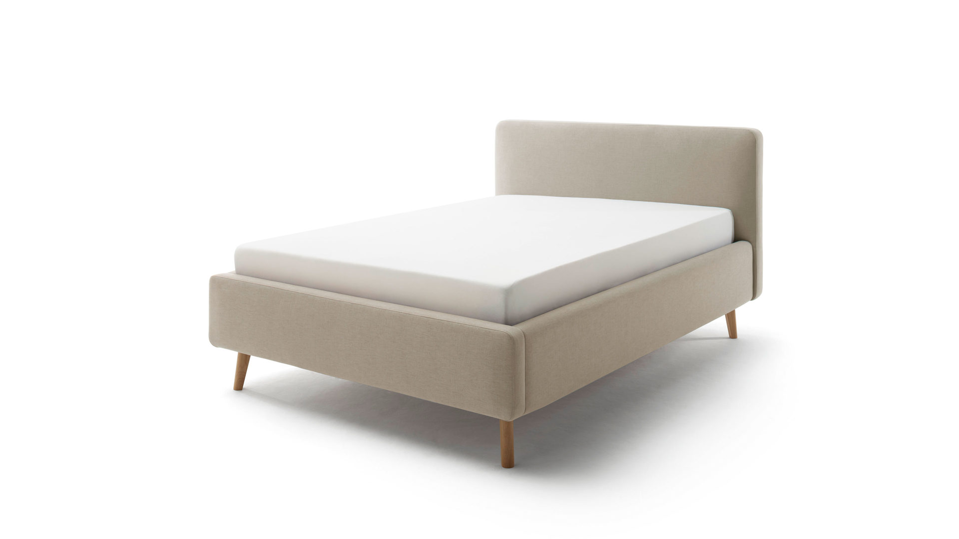 Das Polsterbettgestell Mattis begeistert durch die elegante Optik sowie die hervorragende Material- und Verarbeitungsqualität. Es kombiniert einen taupefarbenen Flachgewebe-Bezug mit eichefarbenen Holzfüßen. Sowohl die Bettseiten als auch das Polsterkopfteil sind glatt bezogen. Letzteres lädt Sie ein, sich anzulehnen, wenn Sie abends im Bett vor dem Schlafen noch fernsehen oder in einem Buch lesen.