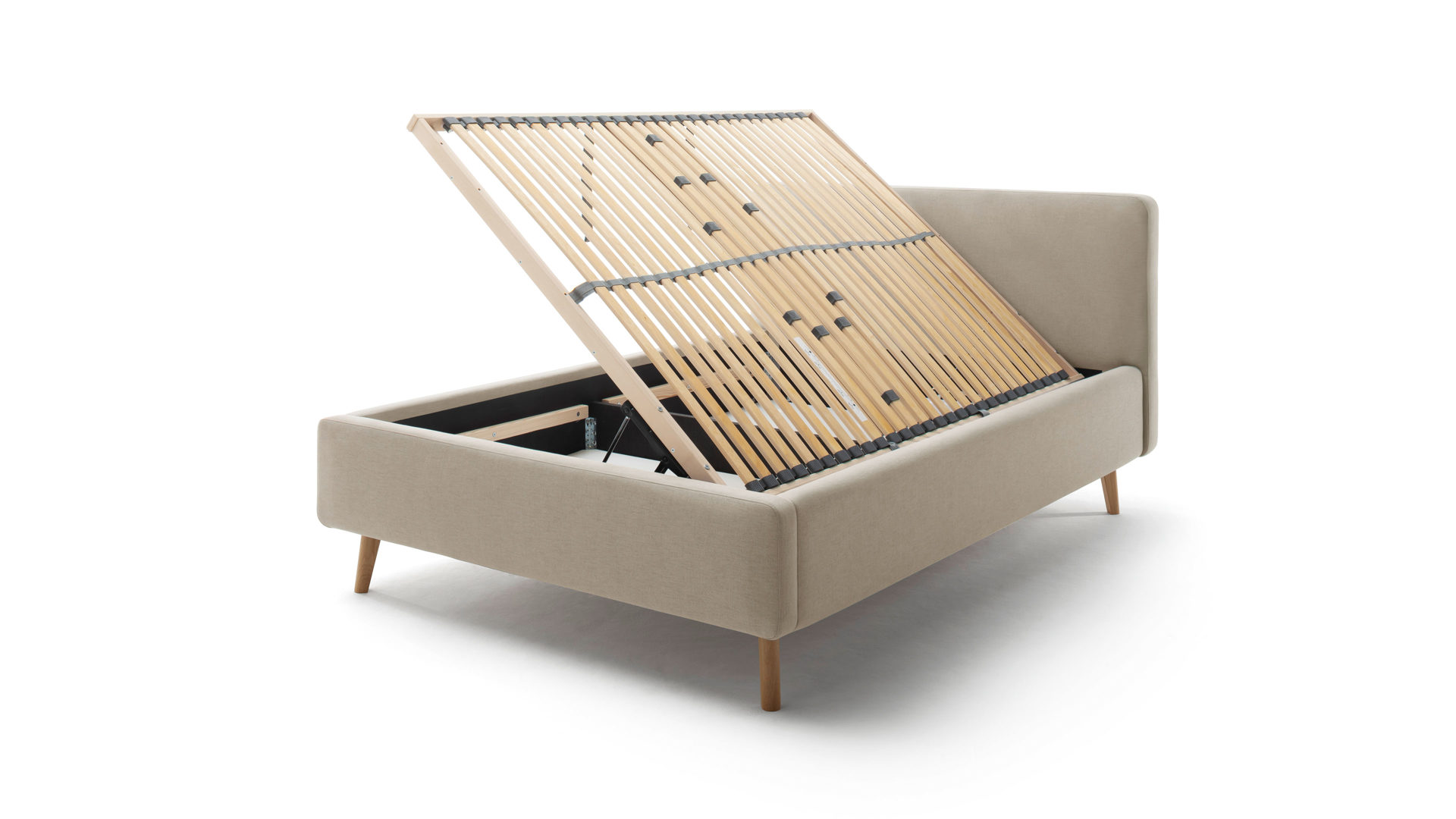 Im Lieferumfang des Bettgestells sind zwei hochwertige Lattenrahmen enthalten, die jeweils 28 Federholzleisten mit Härtegradverstellung aufweisen. Klappen Sie die Lattenrahmen seitlich hoch, um sich Zugang zu den Bettkästen mit Gasdruckdämpfer zu verschaffen. In den geräumigen Kästen können Sie etwa Bettzubehör wie Kissen und Decken sowie viele sonstige Utensilien praktisch platzsparend aufbewahren.
