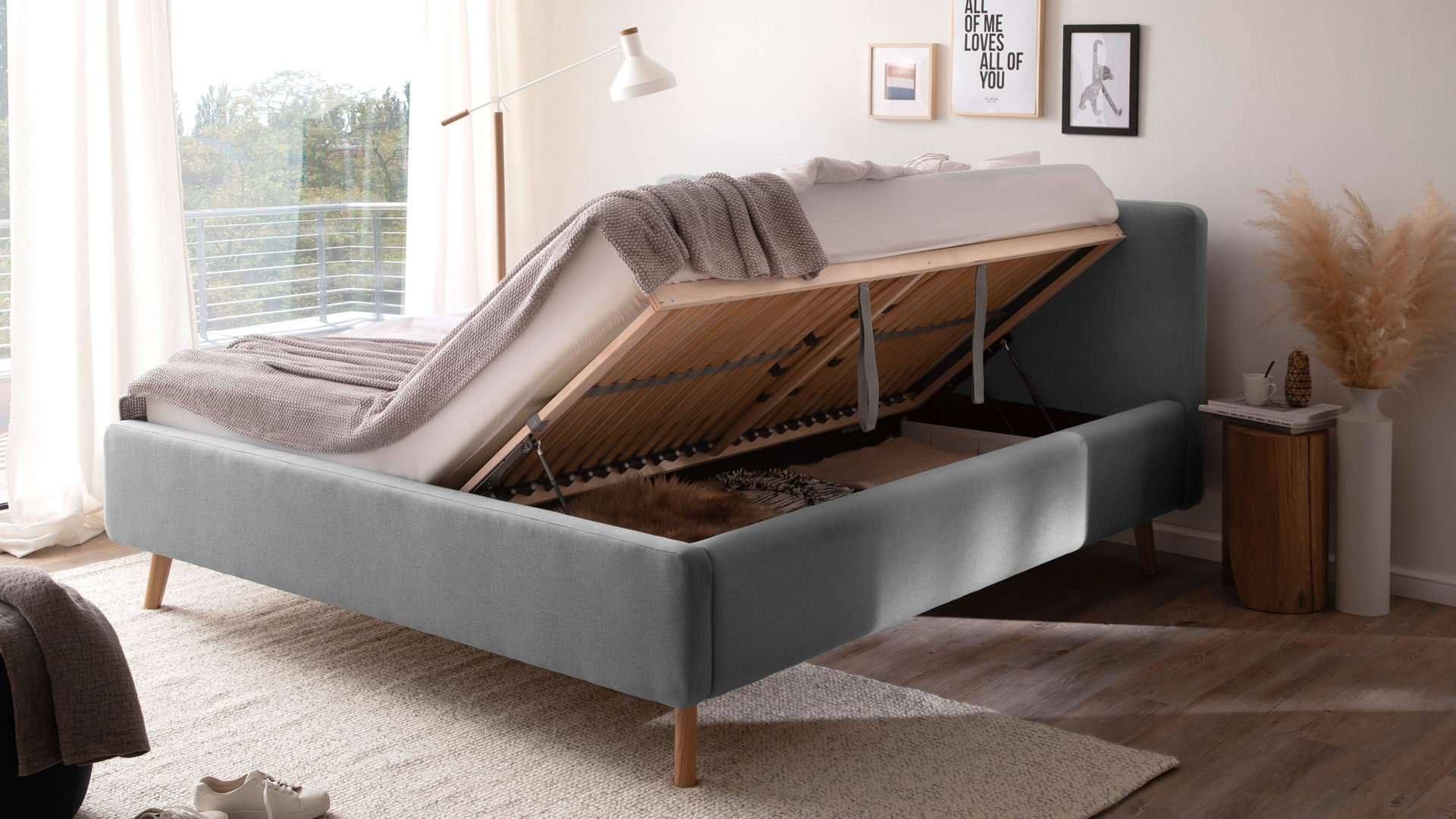 Im Lieferumfang des Bettgestells sind zwei hochwertige Lattenrahmen enthalten, die jeweils 28 Federholzleisten mit Härtegradverstellung aufweisen. Klappen Sie die Lattenrahmen seitlich hoch, um sich Zugang zu den Bettkästen mit Gasdruckdämpfer zu verschaffen. In den geräumigen Kästen können Sie etwa Bettzubehör wie Kissen und Decken sowie viele sonstige Utensilien praktisch platzsparend aufbewahren.