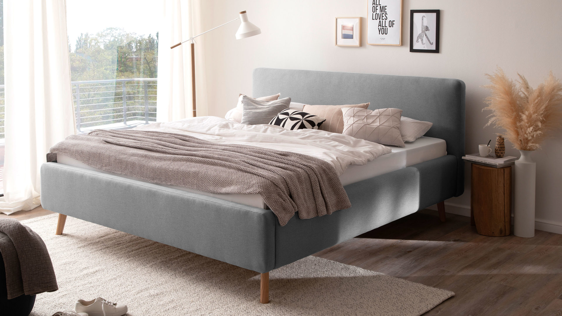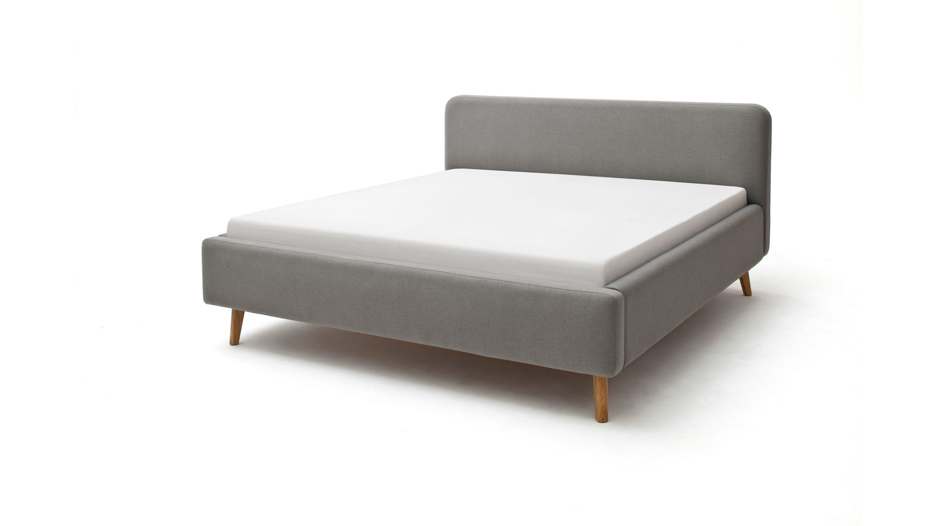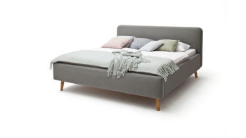Das Polsterbettgestell Mattis begeistert durch die elegante Optik sowie die hervorragende Material- und Verarbeitungsqualität. Es kombiniert einen hellgrauen Flachgewebe-Bezug mit eichefarbenen Holzfüßen. Sowohl die Bettseiten als auch das Polsterkopfteil sind glatt bezogen. Letzteres lädt Sie ein, sich anzulehnen, wenn Sie abends im Bett vor dem Schlafen noch fernsehen oder in einem Buch lesen.