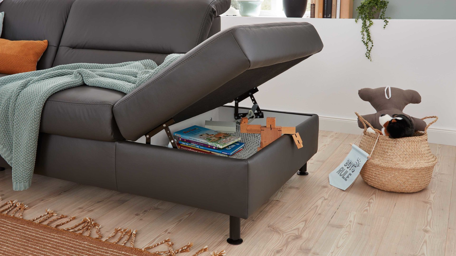 Die Aufklappfunktion F lässt sich in die Abschlusshocker aus dem Modulmaster-Programm MM-PN1148 integrieren. Sie geht mit praktischem, innen weiß beschichteten Stauraum einher, beispielsweise für Zierkissen und Kuscheldecken, wenn diese gerade nicht benötigt werden. Selbstverständlich können Sie je nach Bedarf auch andere Utensilien im aufklappbaren Abschlusshocker unterbringen.