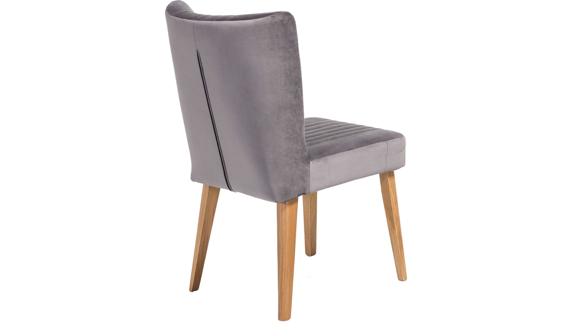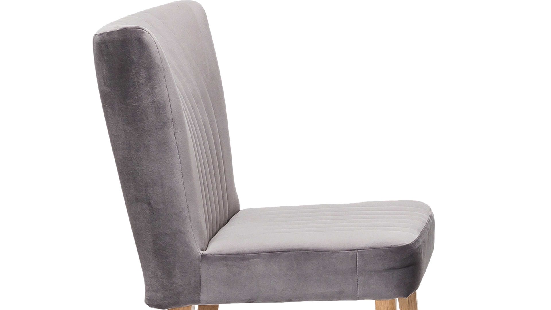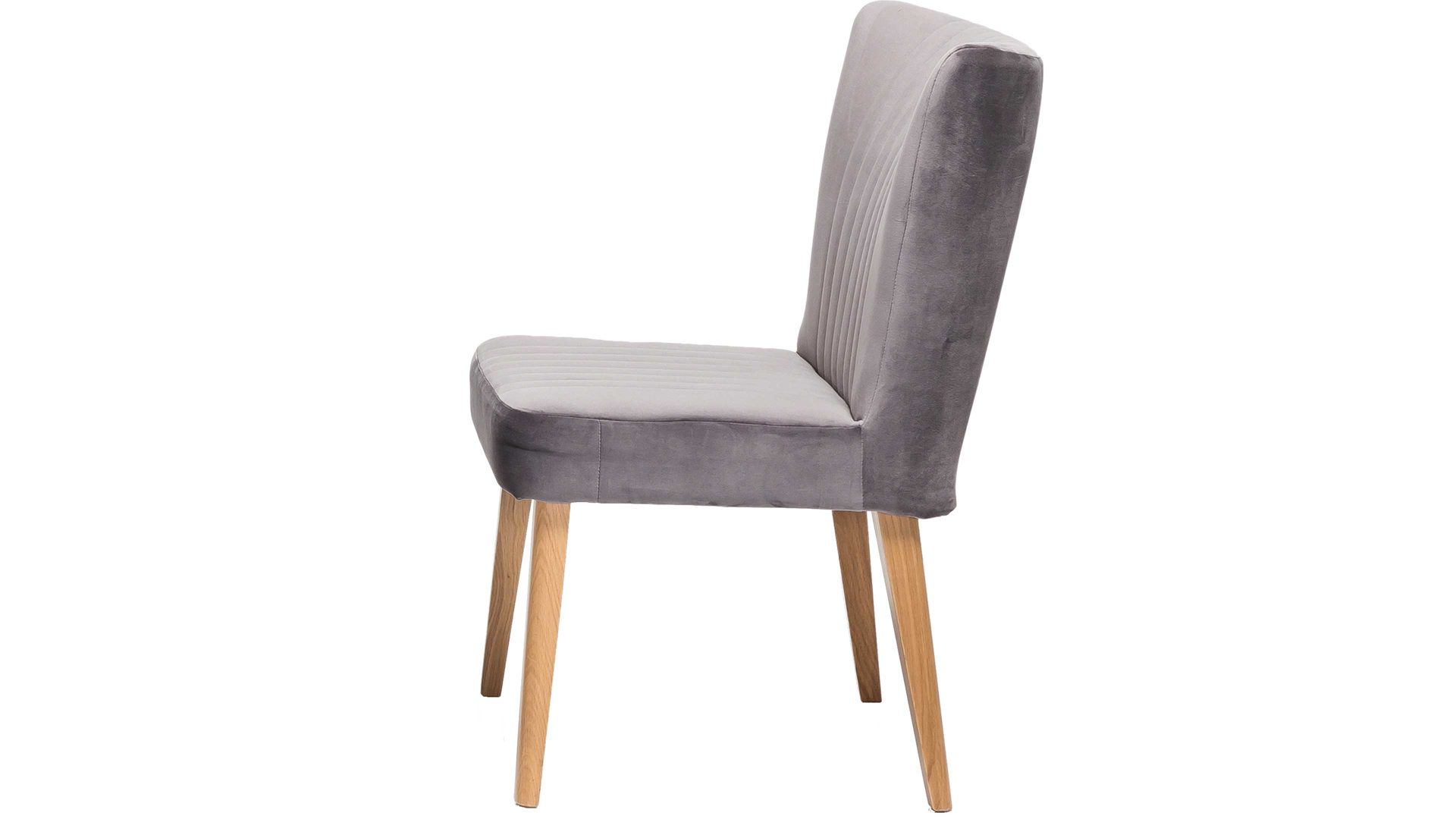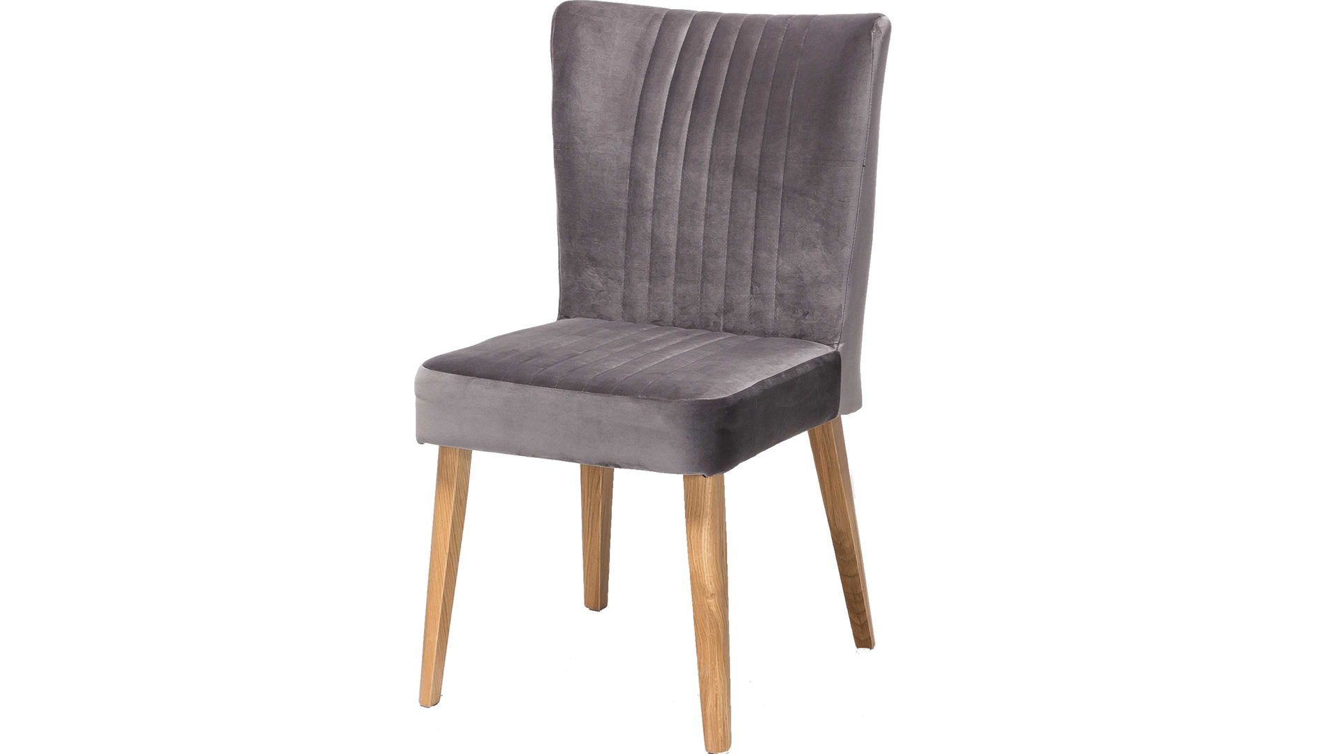 Dieser hochwertige Polsterstuhl mit grauem Bezug hat einen modernen Samtlook und ist damit ein klassisches Sitzmöbel. Eine zusätzlich interessante Optik verleihen dem Esszimmermöbel seine aufwendigen Steppnähte, die auf Sitz und Rücken angebracht sind. Zu mehreren passt der Polsterstuhl mit den Maßen von ca. 46 x 92 x 66 cm (BxHxT) optimal an einen Esstisch aus Eiche, denn das Holzgestell besteht ebenfalls aus Eiche natur.