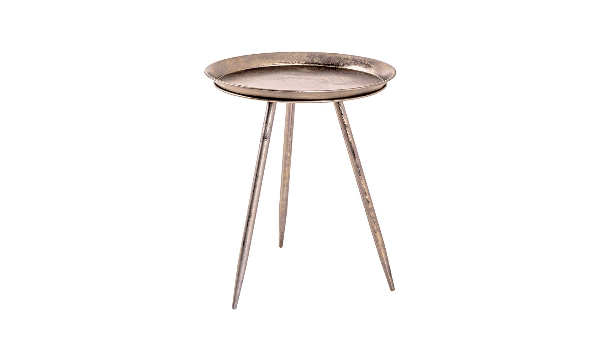 Mit seinem modernen, extravaganten Design wird dieser Beistelltisch zum dekorativen Hingucker im Wohn- oder Schlafzimmer, aber auch im Flur oder Home Office. Dazu überzeugt er qualitativ. Sowohl die Tischplatte als auch das dreibeinige Gestell besteht aus antikbronzefarben lackiertem Metall.