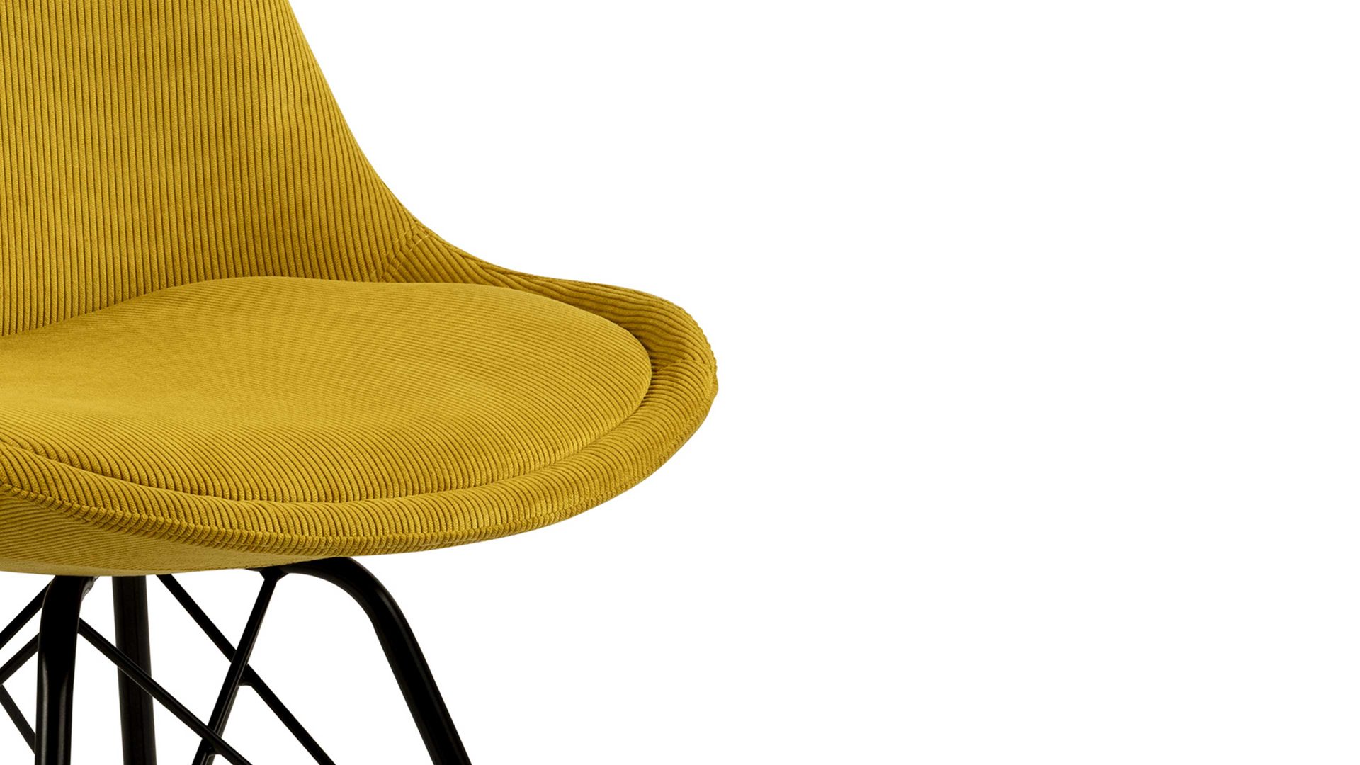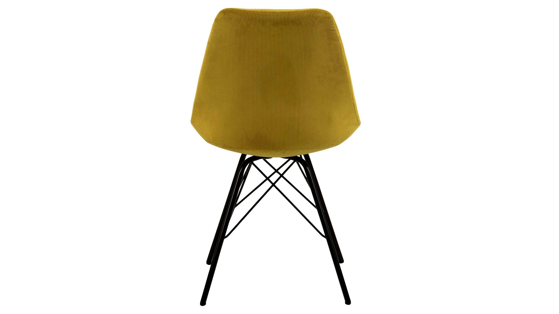 Dieser Polsterstuhl verkörpert klassische Eleganz. Als stabile, dabei aber wunderbar filigran designte Basis fungiert ein mattschwarz pulverbeschichtetes Stahldrahtgestell. Darauf befindet sich eine gelbe Sitzschale aus robustem Kunststoff. Sie ist rundherum mit Feincord bezogen, ebenfalls in warmem Gelb. Der angesagte Feincordbezug überzeugt sowohl qualitativ als auch optisch und haptisch.