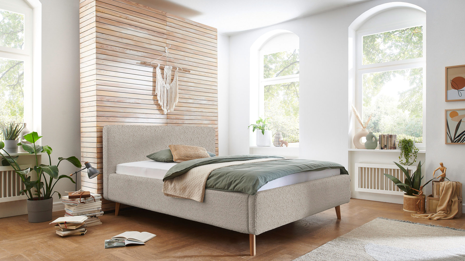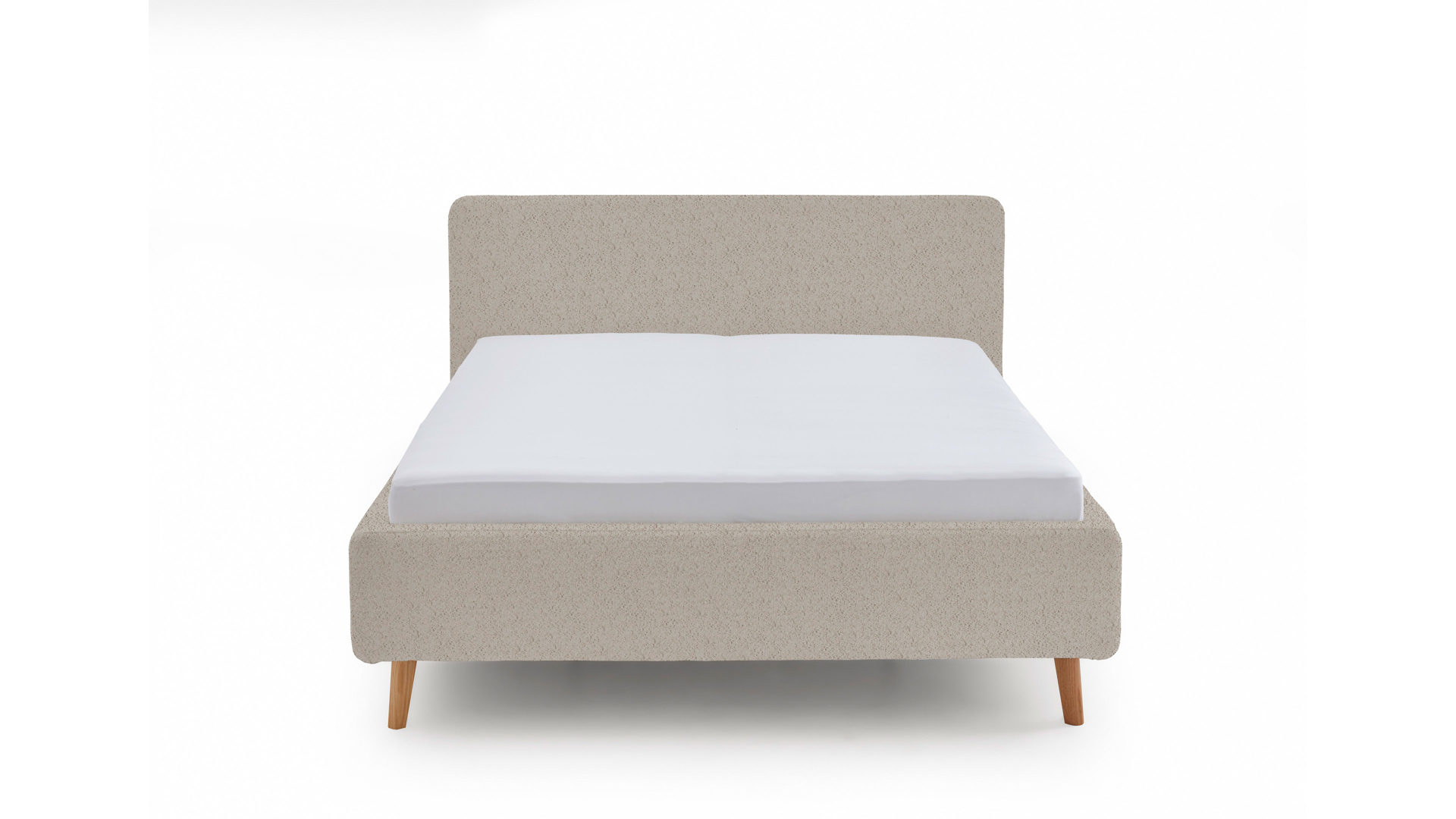 Mit den eichefarbenen Holzfüßen und dem beigefarbenen Boucle-Bezug bringt das Polsterbettgestell Mattis maritimes Flair in Ihr Schlafzimmer.