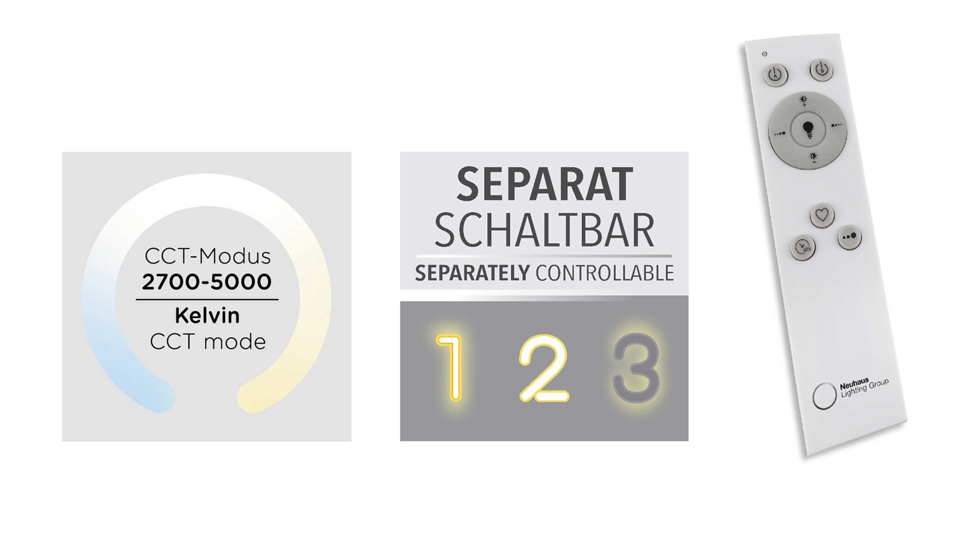| Verstellbarkeit und Funktion: | drehbar Fernbedienung Memoryfunktion CCT | Lichtmanagement | |