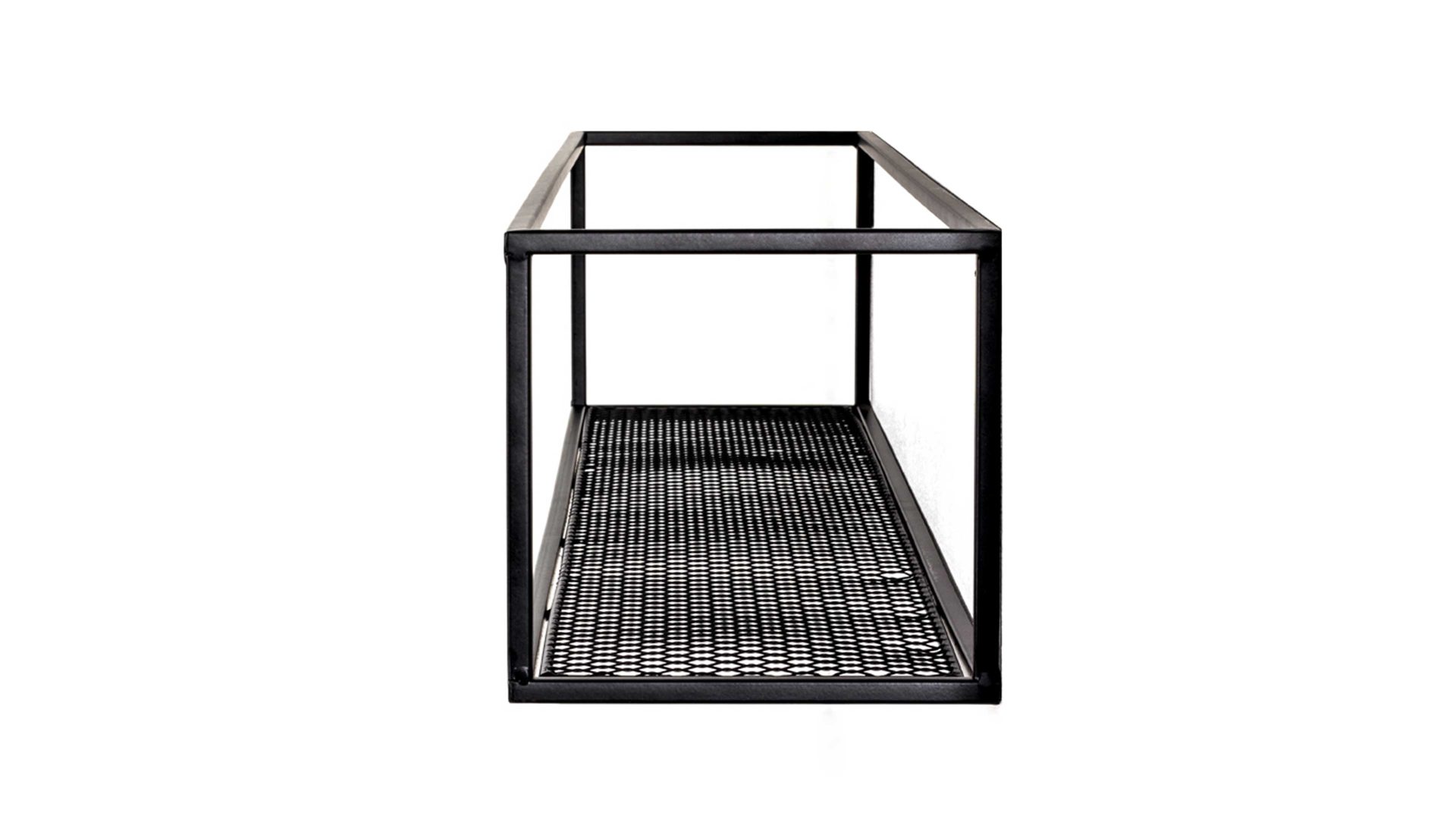 Dieses hochwertige Wandregal repräsentiert die Eleganz schlichter Modernität. Aus einem klassisch mattschwarz lackierten Metallgeflecht und Vierkantrohr-Metallrahmen gefertigt, erscheint es puristisch und ist dazu enorm robust und langlebig. Seine Maße betragen ca. 50 x 16 x 16 cm (LxHxT).