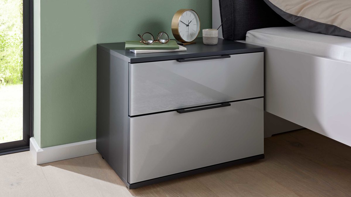 Die Nachtkommode aus der Interliving Schlafzimmer Serie 1210 ist die perfekte Ergänzung für dein Schlafzimmer. Fronten mit seidengrauer Glasauflage, ein basaltgrau lackierter Korpus und anthrazitfarbene Griffen bringen moderne Eleganz direkt an dein Bett. Ob als klassische Nachtkonsole, praktischer Nachtschrank oder stilvolles Beistellmöbel – dieses Möbelstück fügt sich harmonisch in dein Zuhause ein.