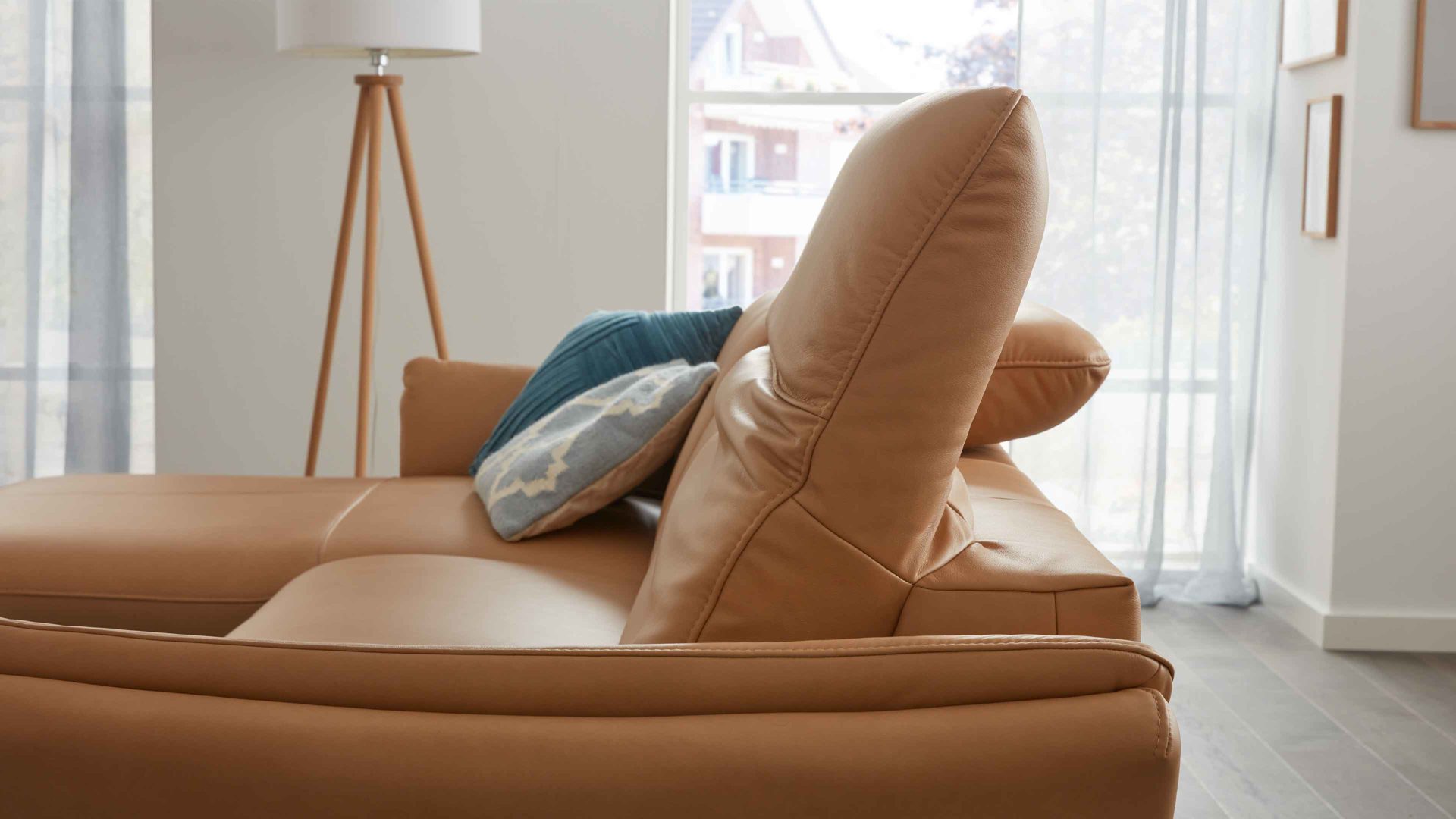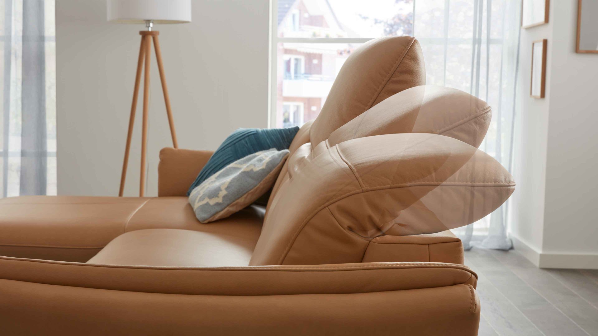 Die Kopfteilverstellung KV mit Faltenoptimierung ist ein Funktions-Mehrpreis für verschiedene Möbel aus der Modulmaster-Polsterserie MM-PN1161. Mittels Rasterbeschlag können Sie das Kopfteil manuell mehrfach in der Neigung verstellen, sodass die Gesamthöhe der jeweiligen Couch von ca. 85 bis 110 cm variiert.