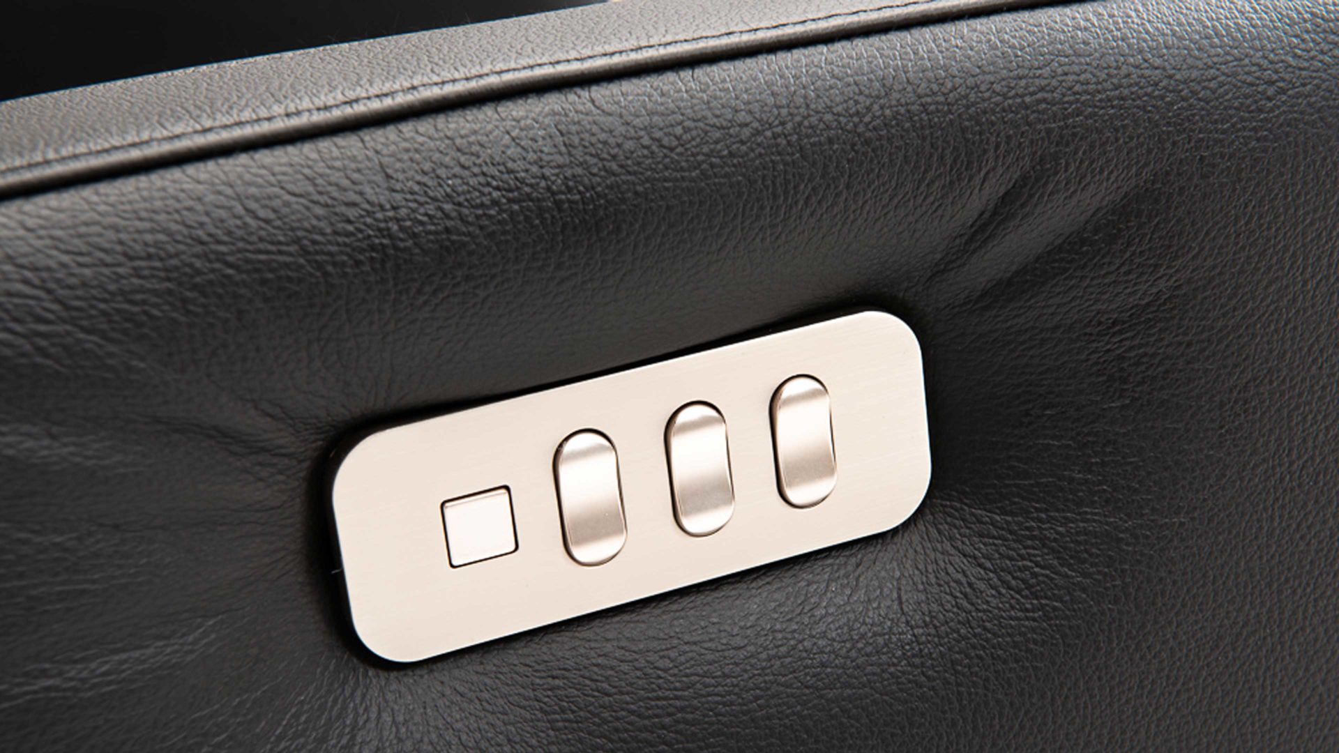 Drehsessel mit getrennten motorische Relaxfunktionen, bedienbar über ein außenliegendes silberfarbenes Control-Panel