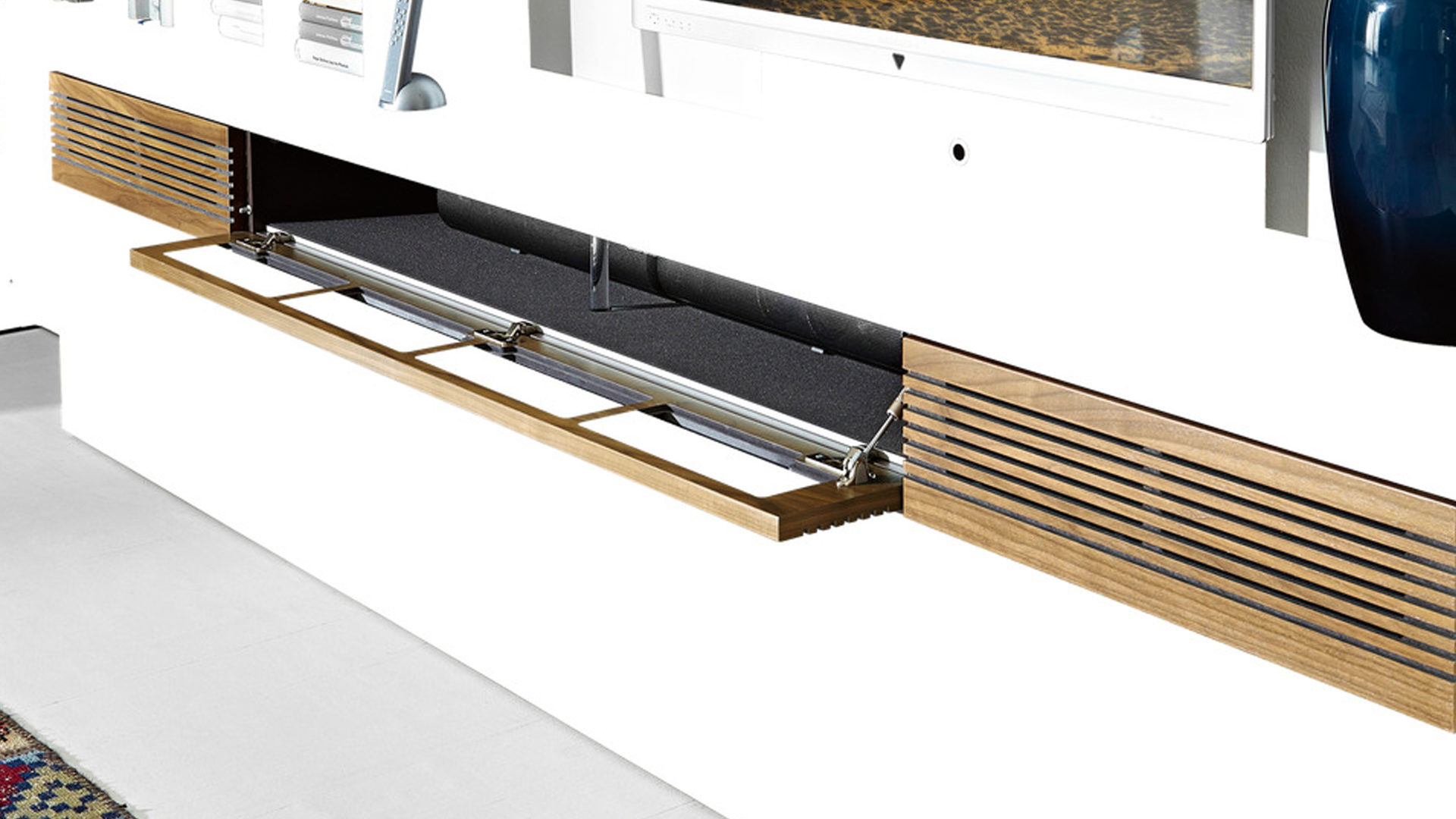 Die Vision Wohnkombination beeindruckt mit mattweißen Lackoberflächen und akzentuierendem Eichefurnier im Farbton Sand. Durch die helle Farbgebung strahlt die Wohnwand herrlich warmen, einladenden Charme aus. Speziell sind überdies die grifflosen Fronten. Zum Öffnen und Schließen der Türen, Klappen, Auszüge und Schubladen dienen unauffällige, praktische Griffleisten.