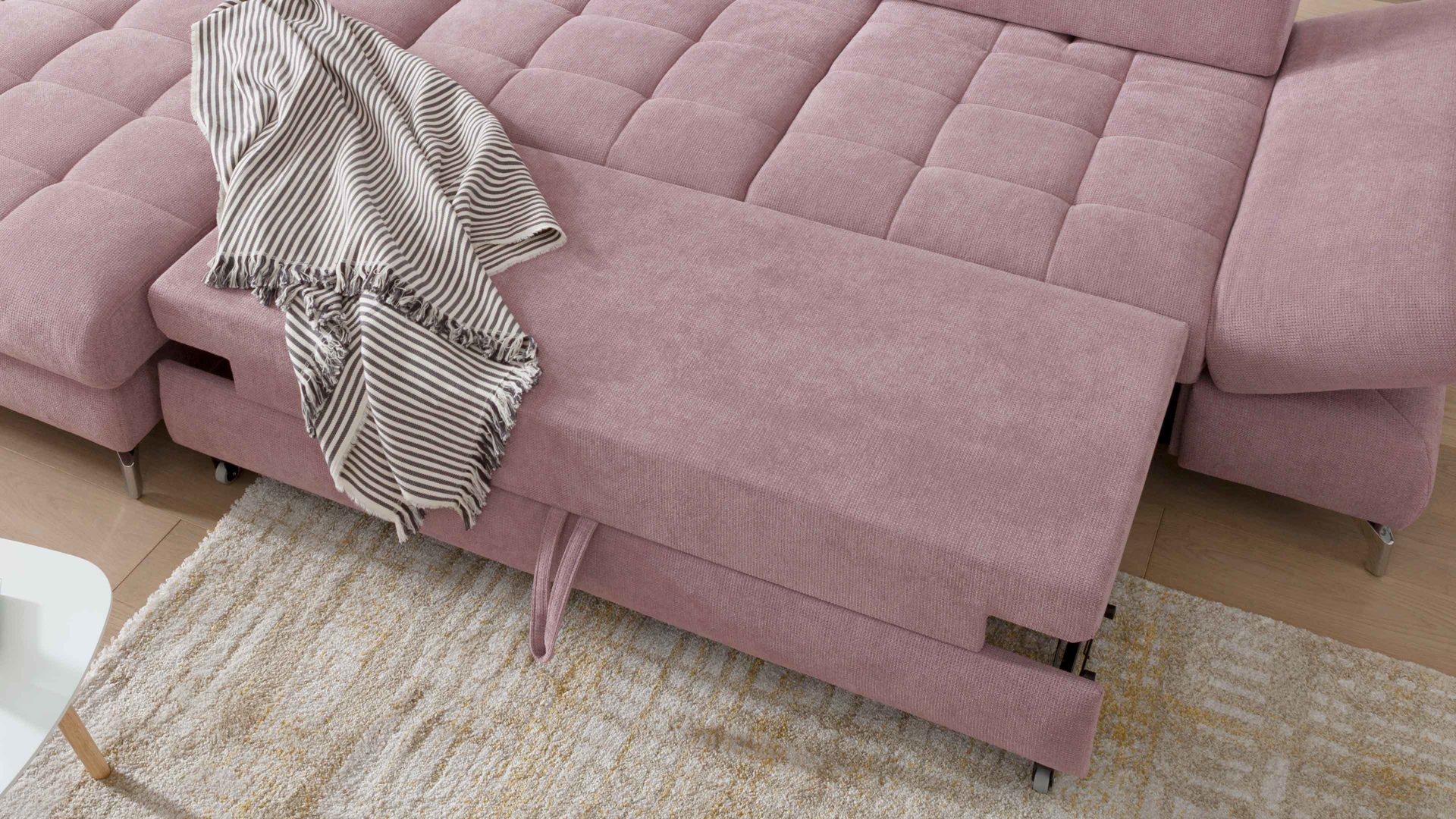 Mit der Möglichkeit zum Ausziehen wird die jeweilige Couch noch flexibler einsetzbar und dadurch gemütlicher, entspannender sowie erholsamer. Beispielsweise können Sie das Sofa hin und wieder ausfahren, um buchstäblich ausgedehnt zu relaxen - oder um Ihren Gästen einen Schlafplatz zur Verfügung zu stellen. Die Liegefläche wird immer im Originalstoff des Sofas bezogen.