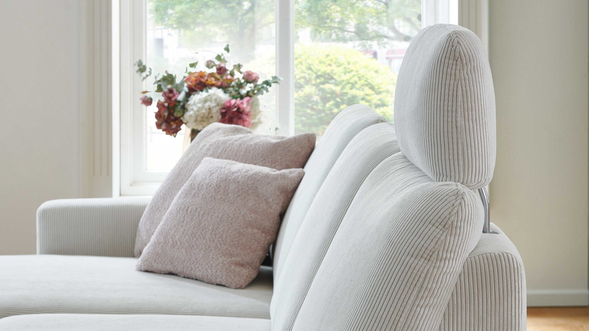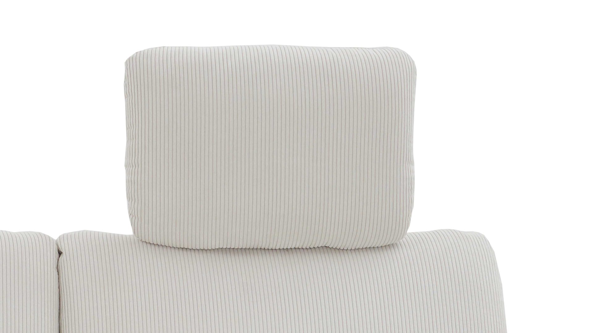 Sie lässt sich manuell in der Höhe und Neigung verstellen. Die mitgelieferte Kopfstützen-Vorrichtung aus robustem verchromten Metall ermöglicht die stufenlose Fixierung der Kopfstütze, deren Maße sich auf ca. 44 x 32 x 16 cm (BxHxT) belaufen. Mit dem naturweißen Feincordbezug harmoniert das Kopfpolster perfekt mit den Couches im gleichen Design.