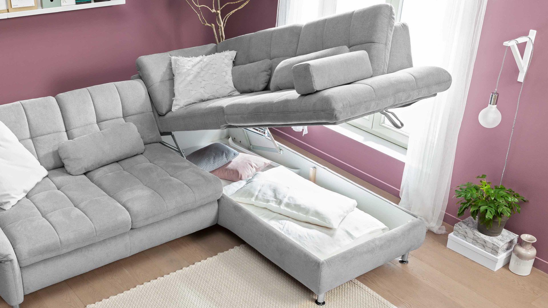 Der Bettkasten bildet ein praktisches Mehrpreis-Zubehör für das Ecksofa des Modells Modulmaster MM-MP1143.