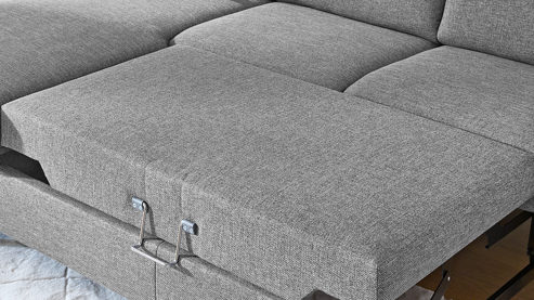 stahlfarbener Flachgewebebezug und mattschwarze Metallfüße