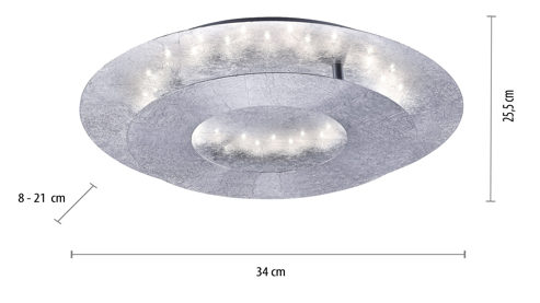 Gold oder Silber – in diesen edlen Farben gibt es die Deckenlampe des Herstellers Paul Neuhaus. Mit dieser Lampe aus silberfarbenem Metall erhalten Sie eine außergewöhnliche Lichtquelle für Ihr Wohnzimmer. Auch in Ihren Flur oder Eingangsbereich passt die LED-Deckenleuchte Nevis mit einem Durchmesser von ca. 27 cm. An der Deckenplatte befindet sich ein kleiner Ring mit einem Durchmesser von ca. 17 cm.