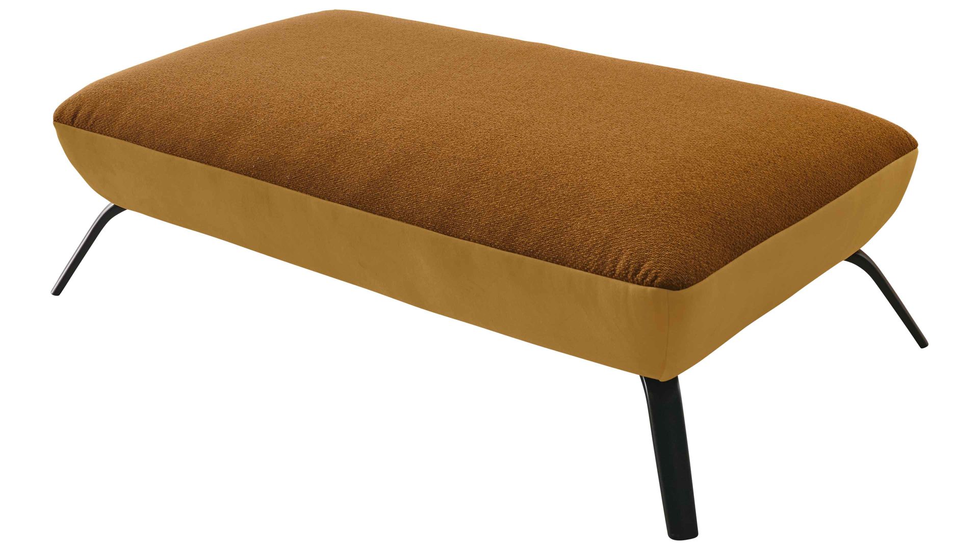 Er verbindet eine Stoffkombination aus senffarbenem Flachgewebe und goldfarbener Maschenware mit mattschwarzen Metallfüßen. Dank der hochwertigen PUR-Schaumpolsterung auf einer erstklassigen Wellenunterfederung genießen Sie auf diesem Hocker hervorragenden Sitzkomfort.