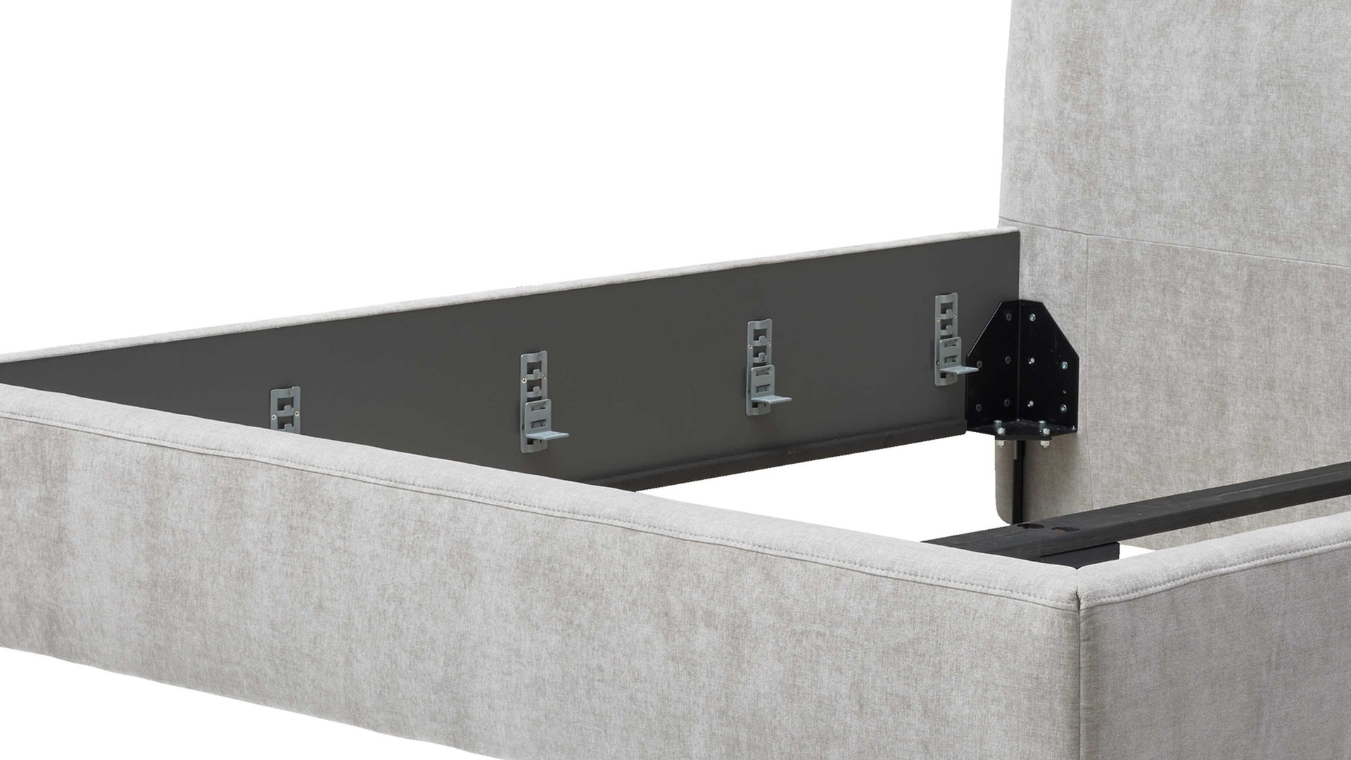 Die kubisch gepolsterten Bettseiten mit anthrazitfarben lackierter Innenseite bilden einen stilvollen Kontrast zum Stoffbezug und werden durch die schwarzen Metallfüße elegant ergänzt. Für individuelle Gestaltung stehen vier weitere Fußvarianten in zwei Höhen zur Auswahl.