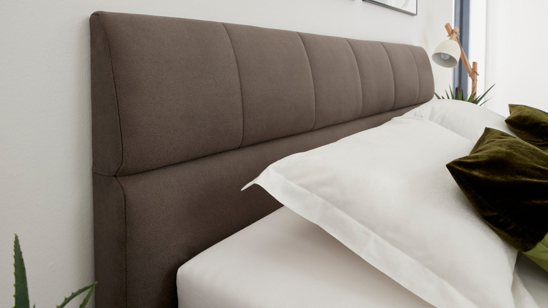 Das edle Polsterbett Malea kombiniert alufarbene Füße als schlicht-robuste Basis mit einem klassisch-braunen Stoffbezug. Zusammen sorgen die Materialien und Farben für eine moderne, elegante und auch warme Ausstrahlung. Das Polsterkopfteil mit schicker Steppung bildet einen optischen wie funktionalen Höhepunkt.