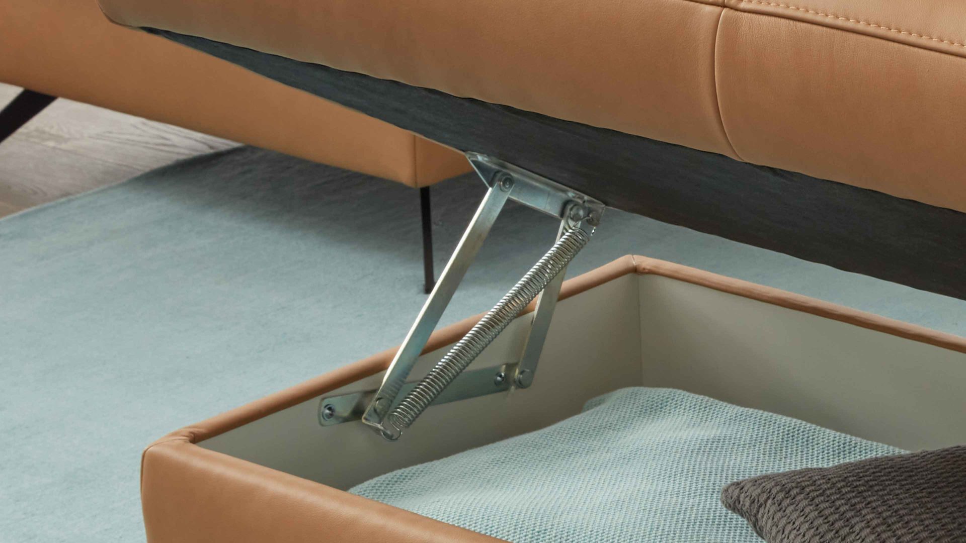 Die manuelle Aufklappfunktion geht mit praktischem, innen weiß beschichteten und belüfteten Stauraum für Wohntextilien, Spielzeug und andere Gegenstände einher.