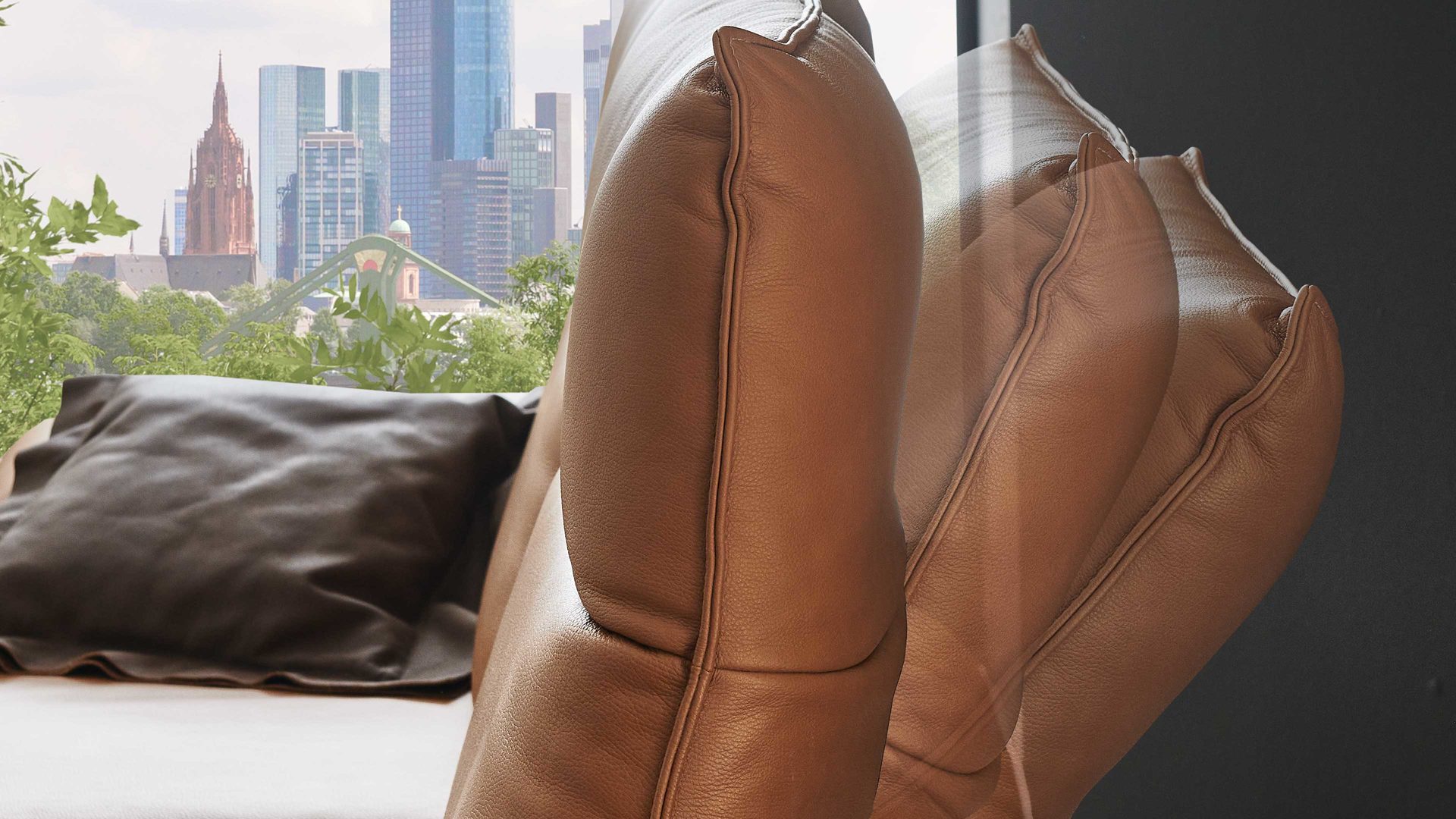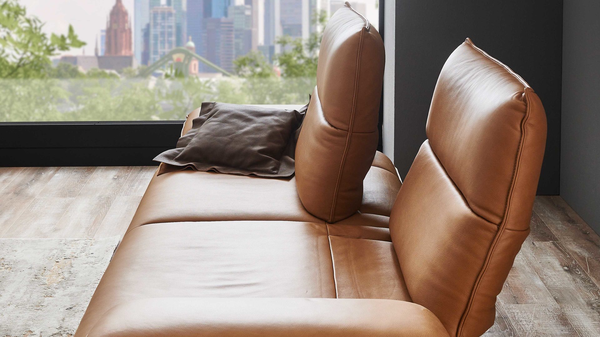 Besonders hervorzuheben sind die Funktionsrücken und die Sitztiefenverstellung des Sofas. Durch die zweifach verstellbare Rückenlehne mit eingearbeiteten Metallgelenken kann die Sitztiefe um bis zu 29 cm vergrößert werden. Dadurch erreicht das Ledersofa eine Gesamttiefe von ca. 113 cm. Durch das Umklappen der Rückenlehne nach hinten verringert sich die Gesamthöhe um bis zu 30 cm, während sich die Gesamttiefe um weitere ca. 34 cm vergrößert.