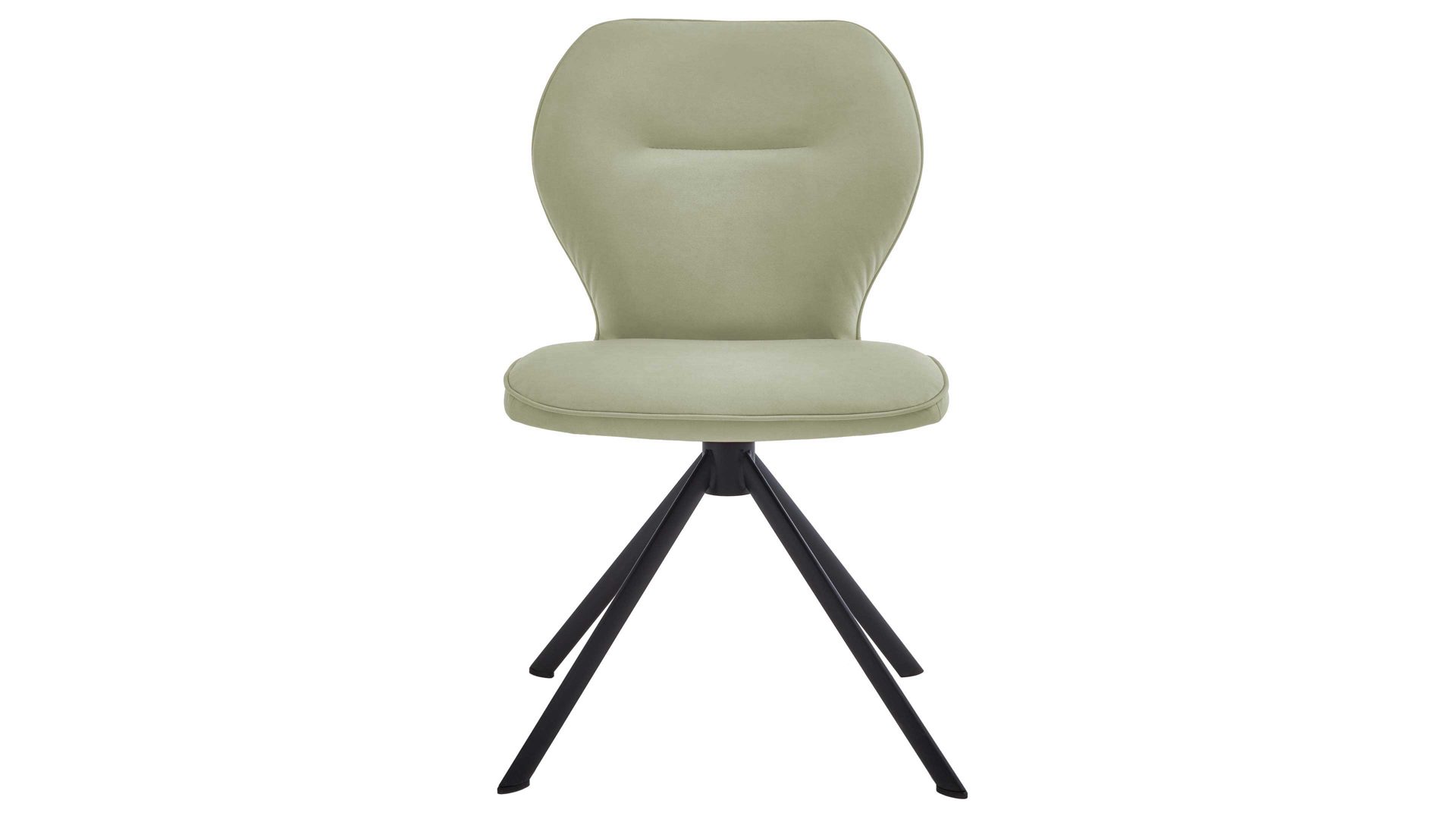 Er kombiniert ein mattschwarz lackiertes Stativgestell aus robustem Eisen mit einem lindgrünen Mikrofaserbezug in Lederoptik und fügt sich in verschiedene Wohnstile harmonisch ein. Zu den optischen Highlights des Esszimmerstuhls gehört neben der Formensprache und den perfekt aufeinander abgestimmten Farben der markante Quereinzug im Rücken. Praktisch begeistern die Drehbarkeit um 180 Grad mit Rückholfunktion sowie die bodenschonenden Gleiter am Gestell.