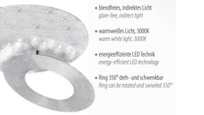 Ein tolles Highlight ist, dass dieser Ring 360 Grad drehbar sowie schwenkbar ist und die Höhe so zwischen ca. 8 und ca. 20 cm variiert. Insbesondere die Oberfläche der Leuchte fällt auf, denn eine Hammerschlaglackierung verleiht dem Metall eine einzigartige Struktur. Das LED-Board mit 6 Watt, 570 Lumen und 3.000 Kelvin ist inklusive. Zudem entspricht das Leuchtmittel der Energieeffizienzklasse G.