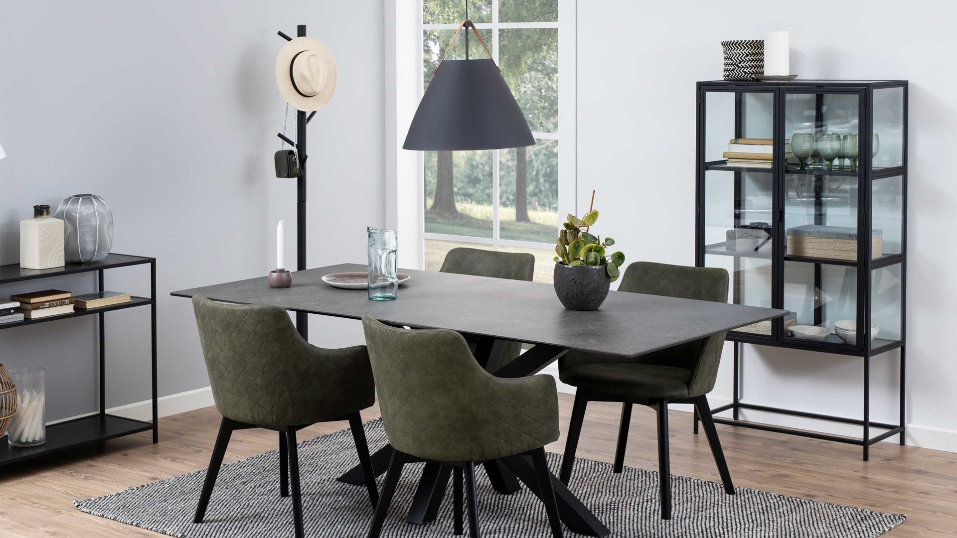 Sein Gestell besteht aus mattschwarz pulverbeschichtetem Metall mit rauer Oberfläche. Hinzu kommen gehärtetes Glas und klassisch-schwarze Esche-Nachbildung, die durch die erstklassige Melaminbeschichtung besonders kratz- und stoßfest sowie wasserabweisend ist, was sie besonders robust und pflegeleicht macht.