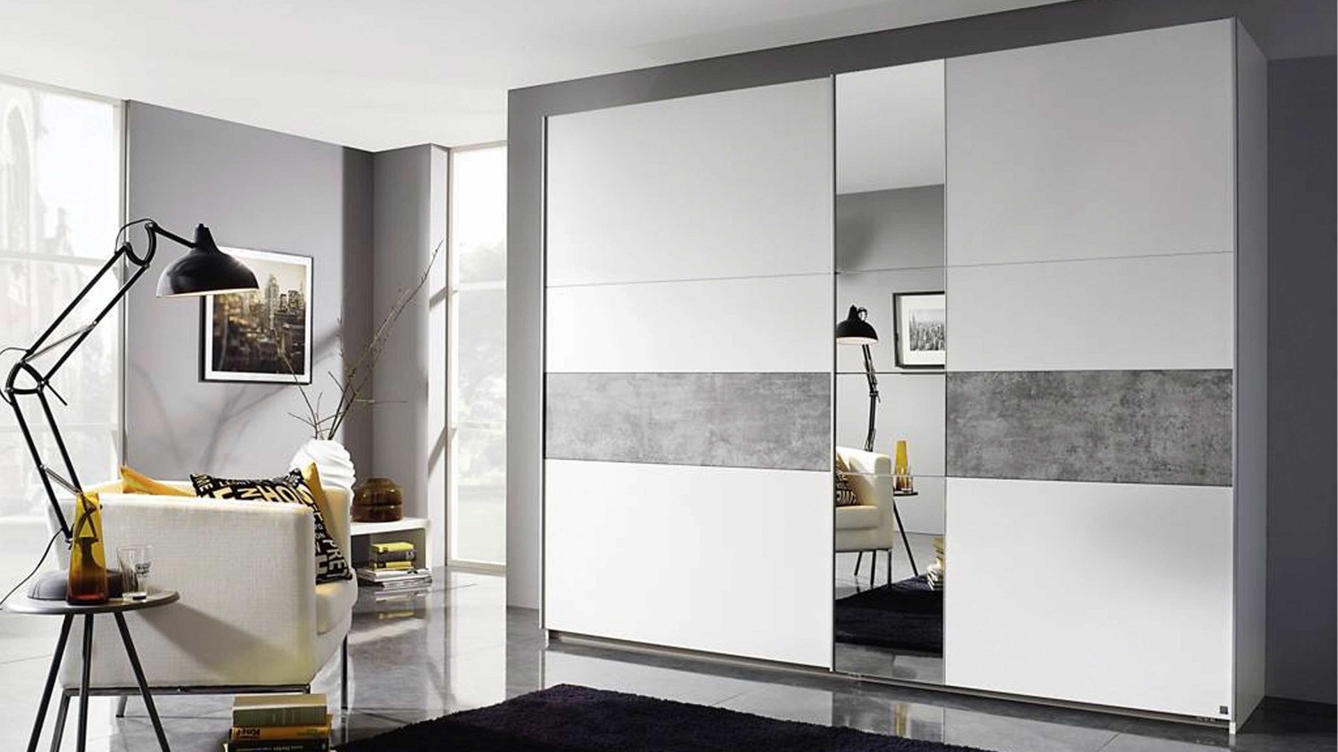 Mit dem modernen rauch BLUE Schwebetürenschrank Korbach haben Sie endlich genug Platz für all Ihre Lieblingskleidung. Die schicken matt alpinweißen und Stone greyfarbenen Kunststoffoberflächen machen den Kleiderschrank zum neuen Hingucker in Ihrem Schlafzimmer. Die alufarbenen Griffleisten des Schwebetürenschrankes geben ihm ein modernes Finish und ermöglichen leichtes Öffnen und Schließen.