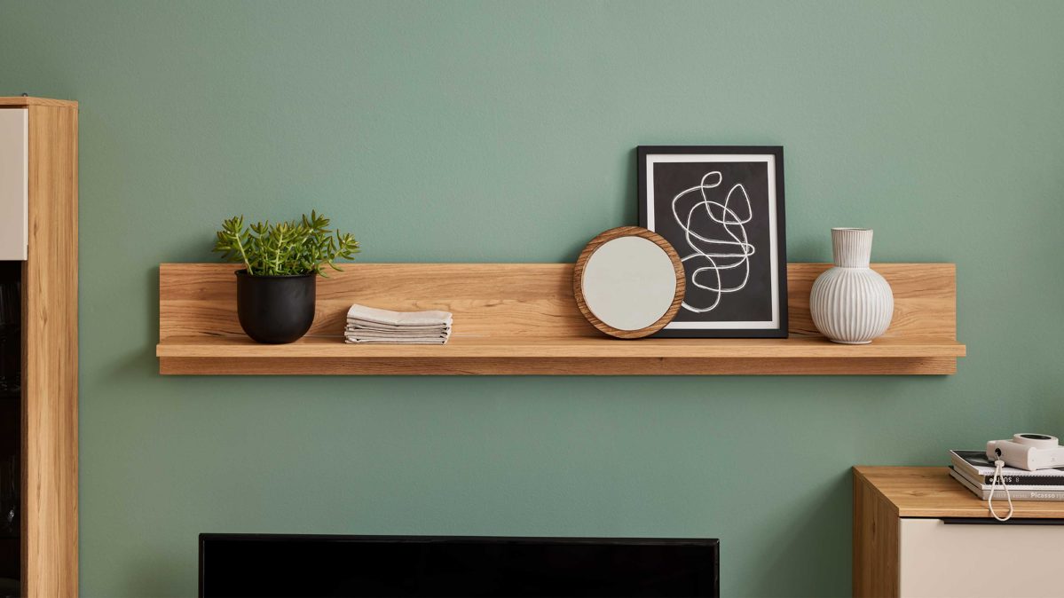 Schlicht, funktional und hochwertig – das Wandboard aus der Interliving Wohnzimmer Serie 2032 ist ein vielseitiges Einrichtungselement, das modernes Design und natürliche anmutende Materialien perfekt kombiniert. Mit ca. 180 x 25 x 19 cm (B/LxHxT) bietet es großzügige Ablagefläche für Bücher, Deko oder Alltagsgegenstände und überzeugt durch eine Belastbarkeit von bis zu 15 kg. Die Ausführung in Risseiche Nachbildung verleiht deinem Wohnzimmer eine warme, wohnliche Ausstrahlung und fügt sich harmonisch in verschiedenste Einrichtungsstile ein.