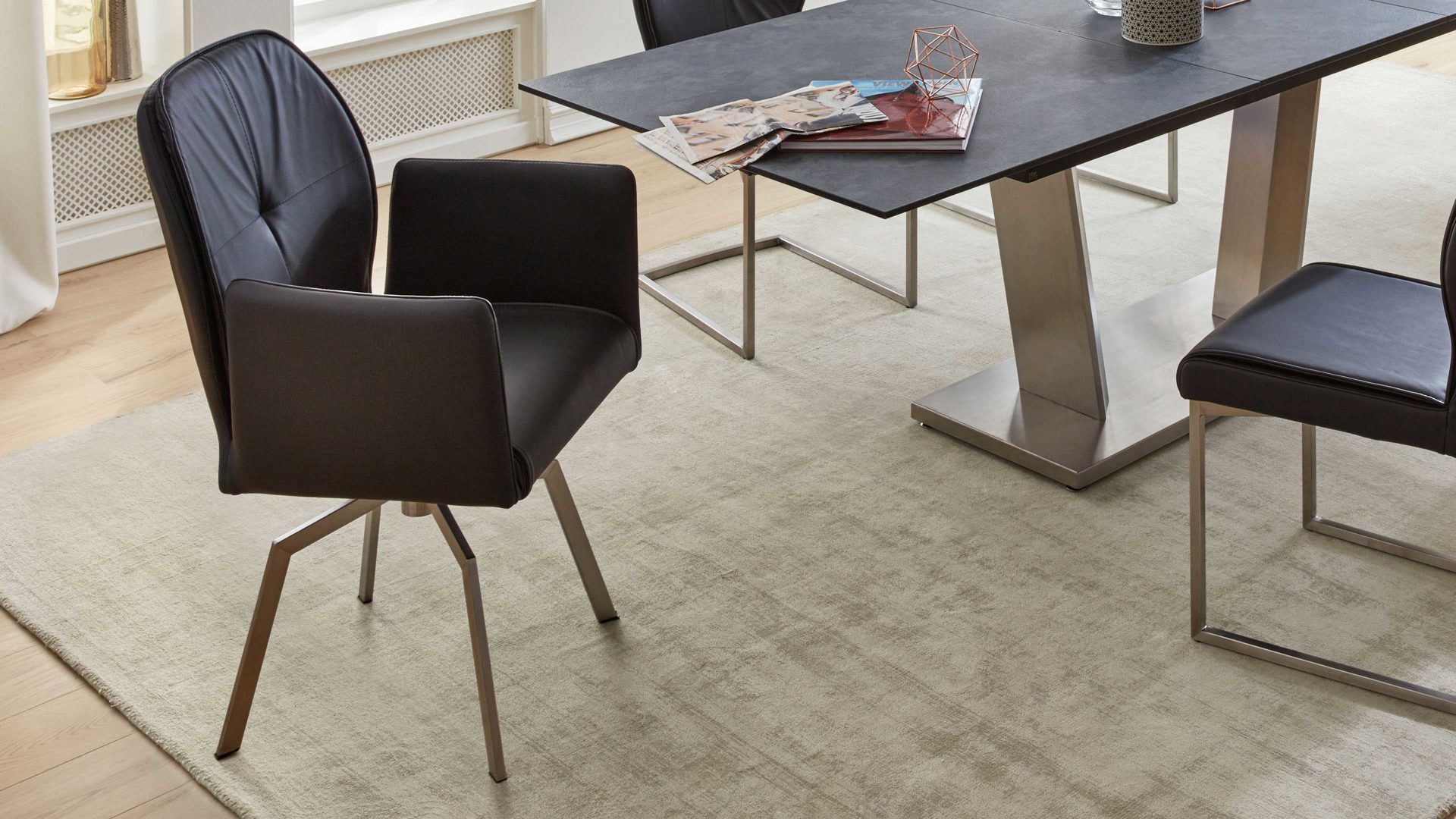 Die Serie 5102 bietet dir ein vielseitig planbares Stuhl- und Tischsystem mit vielen Optionen, um deinen Essbereich individuell zu gestalten. Du kannst zwischen zwei Gestellvarianten wählen, die 180°-Drehfunktion wahlweise mit oder ohne Rückholmechanik kombinieren und dich für Modelle mit oder ohne Armlehne entscheiden. Für den Bezug stehen dir Stoffe, Mikrofaser und Leder zur Verfügung, ergänzt durch drei stilvolle Steppungsvarianten für den Rückenbereich.