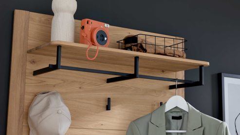 Die furnierte Wandgarderobe verfügt über einen Ablageboden, eine Garderobenstange und fünf Kleiderhaken – ideal für häufig genutzte Jacken oder Taschen. Maße: ca. 90 x 111 x 28 cm (B/LxHxT).
