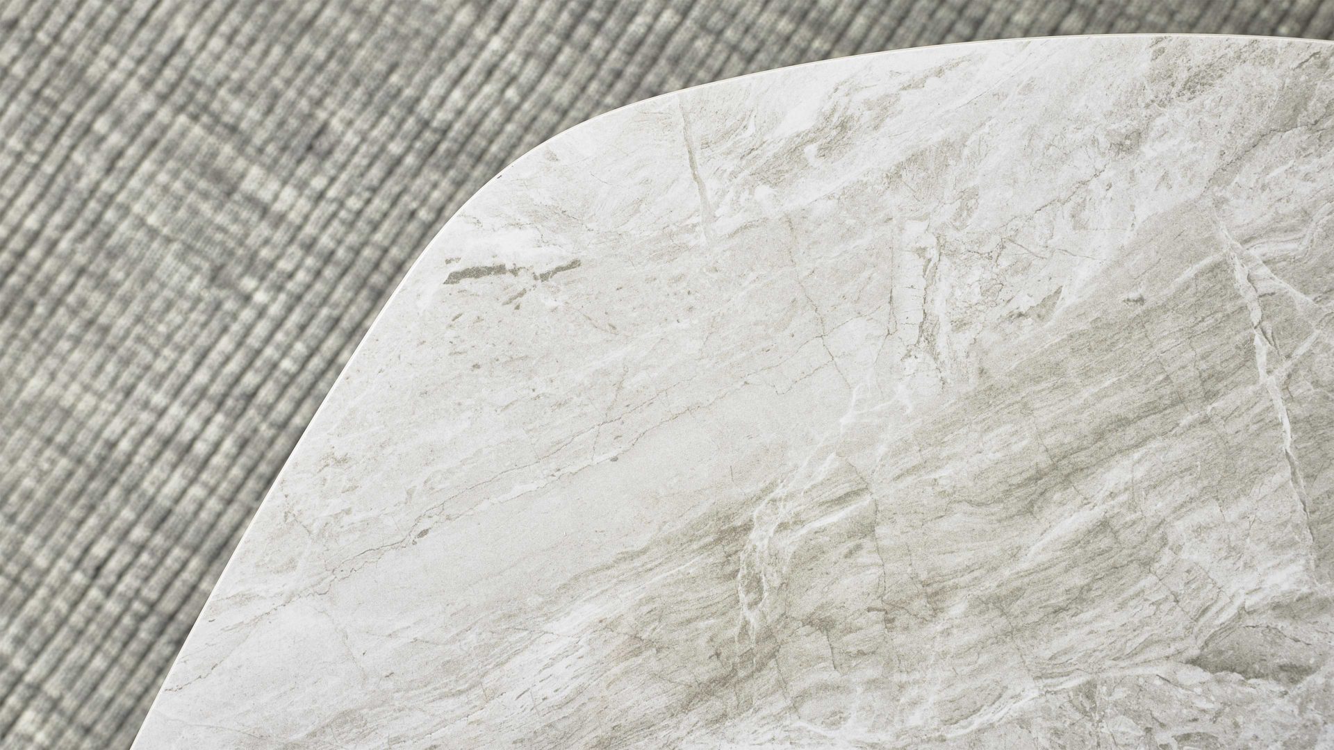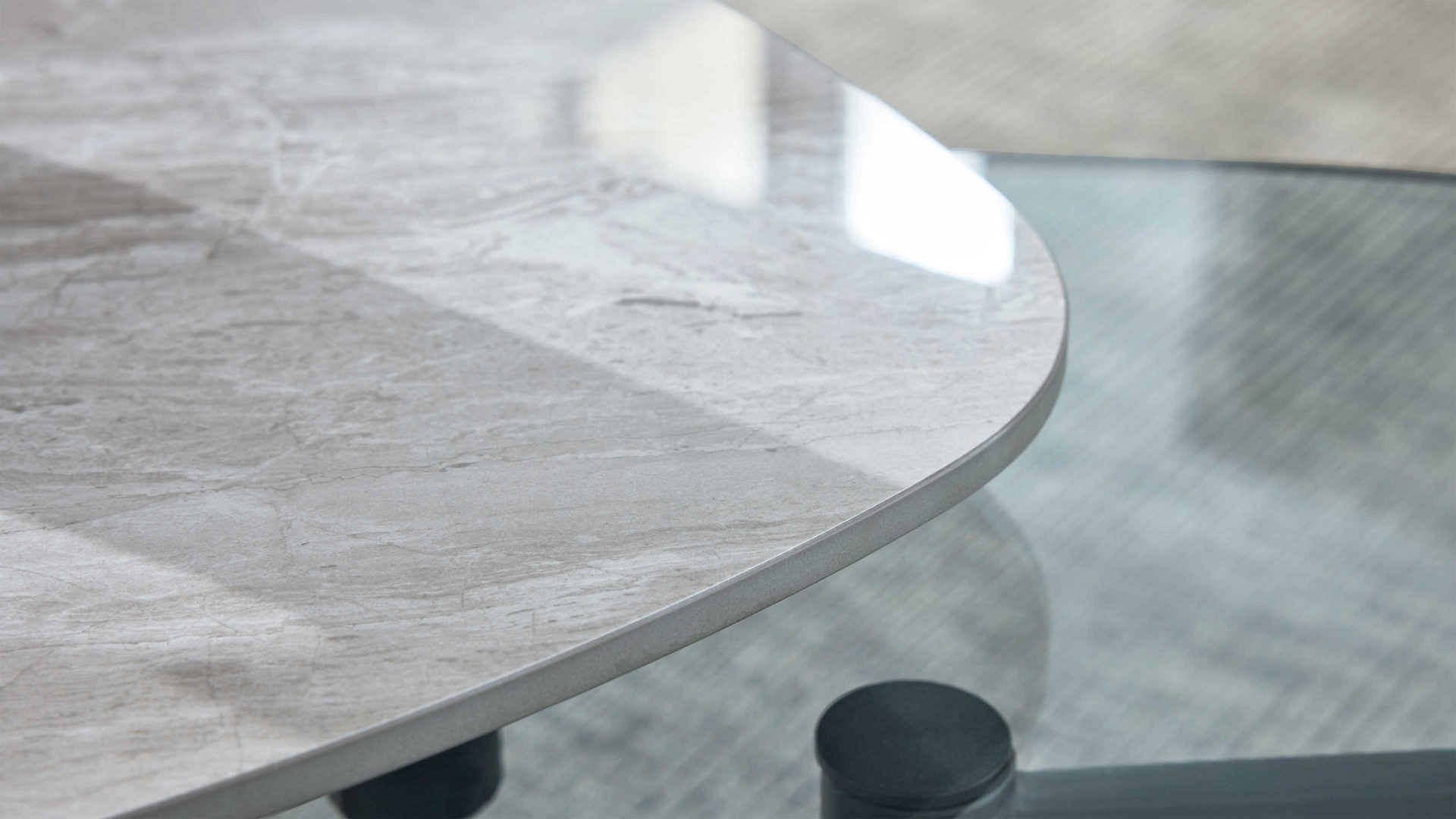 Neben der exklusiven Optik überzeugt der Tisch durch seine intelligente Funktionalität. Die 3 mm starke Keramikplatte ist auf eine 10 mm Glasplatte verklebt – eine stabile, langlebige Verbindung, die höchste Belastbarkeit garantiert. Beide Platten sind schwenkbar, sodass sich die nutzbare Fläche flexibel anpassen lässt. Je nach Ausrichtung variiert die Breite des Couchtischs von ca. 88 cm bis maximal 146 cm, bei einer Tiefe von ca. 75 cm und einer Höhe von ca. 42 cm. Damit passt sich der Tisch perfekt an unterschiedlich große Wohnlandschaften an – ob kompakt oder großzügig gestaltet.