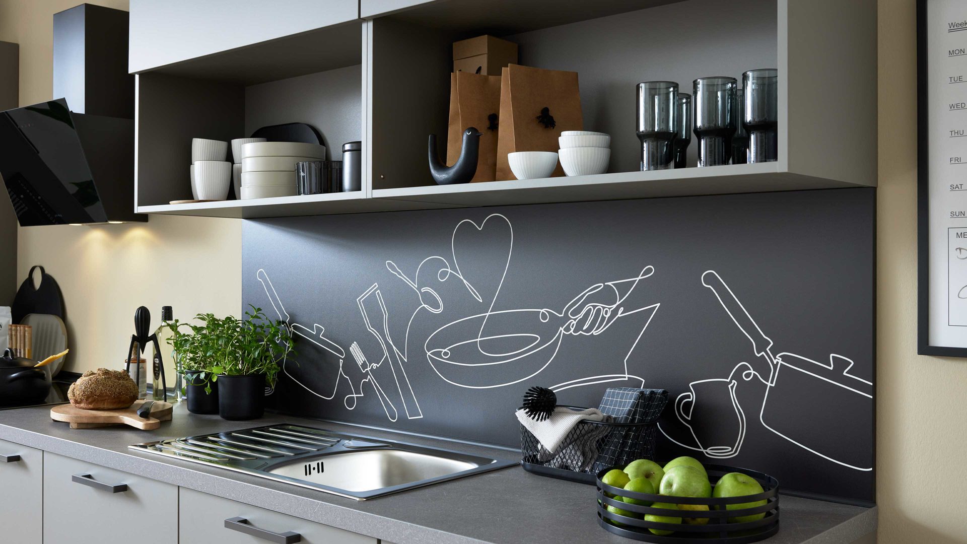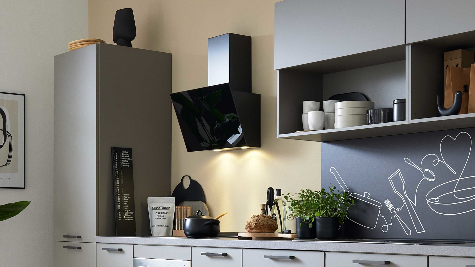 Die exklusive Nischenverkleidung im Dekor Cooking verleiht der Küche eine individuelle Note und sorgt für ein optisches Highlight über der Arbeitsfläche. Zusammen mit den sanft schimmernden Taupefronten entsteht eine warme, wohnliche Atmosphäre, die modernes Design mit Behaglichkeit verbindet.