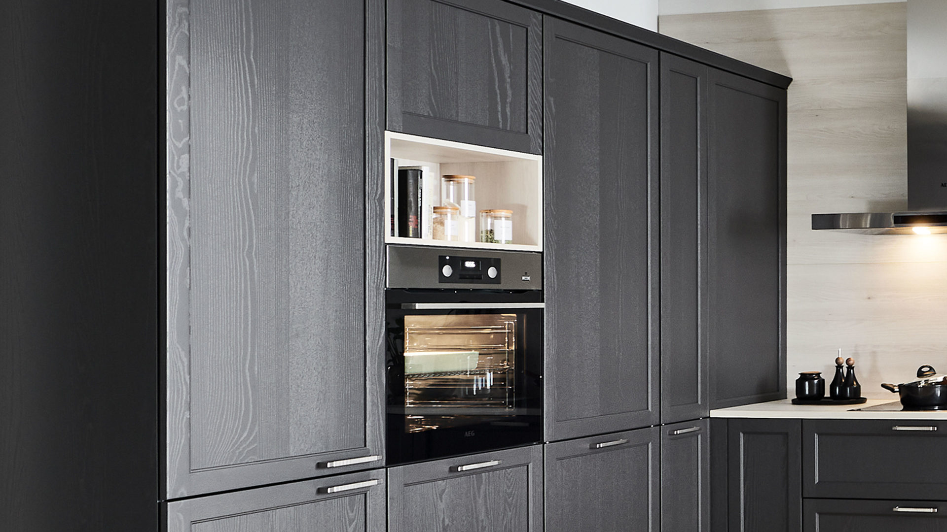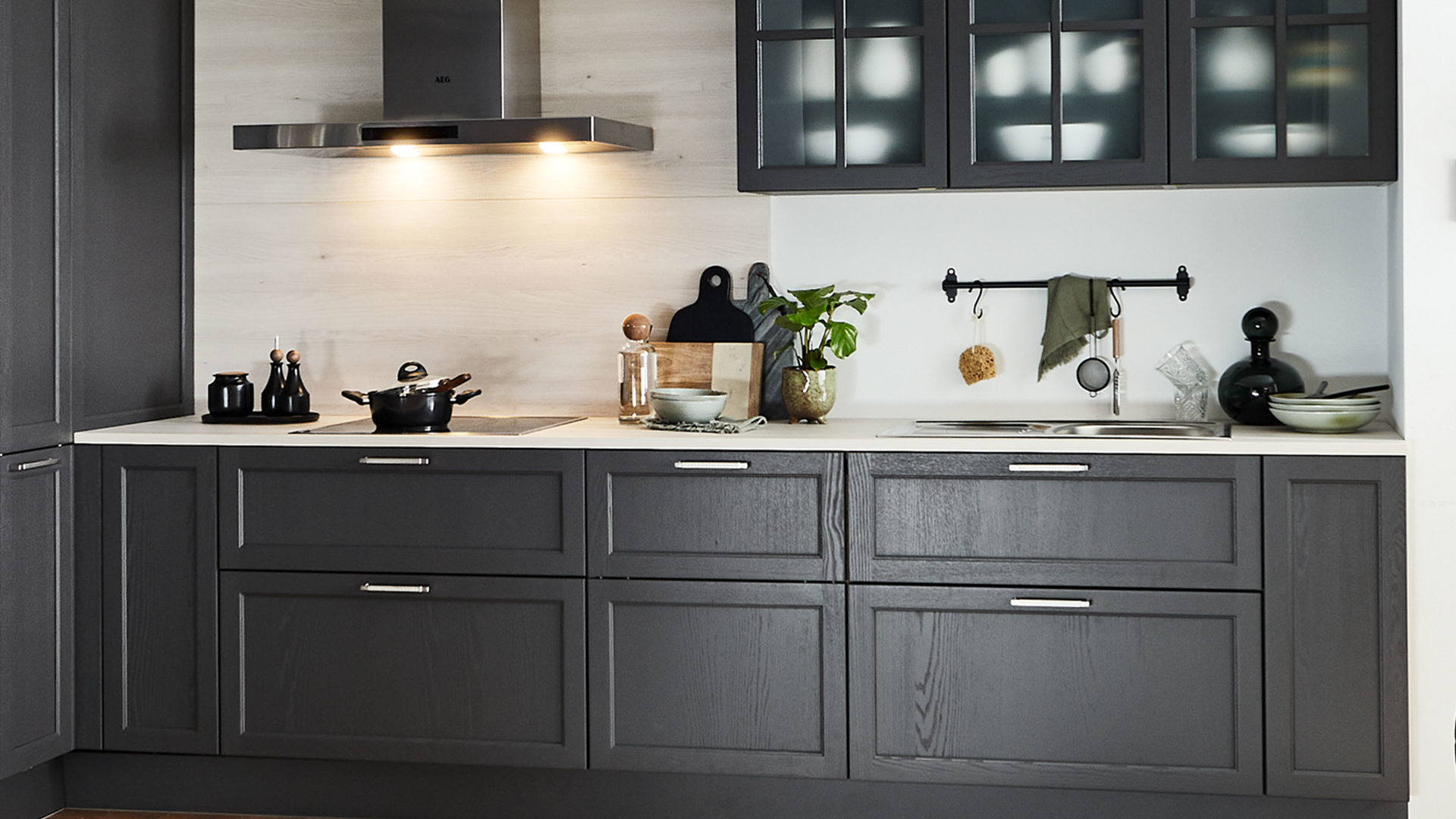 softmatt graphitfarben lackierte Eschenholzfronten mit Maserung, Massivolzrahmen und furnierte Füllung, kombiniert mit edelstahlfarbenen Metallgriffen, Arbeitsplatte und Regal in Kiruna Birke-Nachbildung
