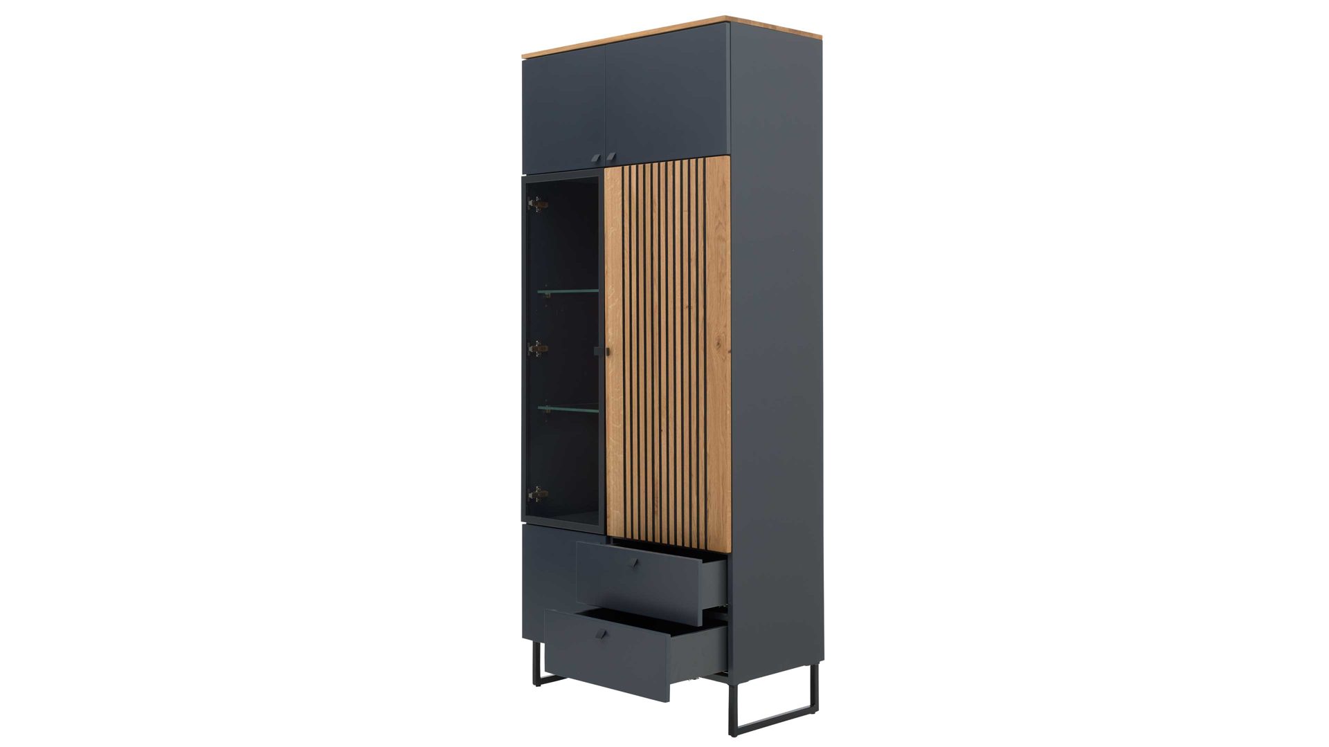 Der Vitrinenschrank überzeugt mit einem vielseitigen Innenleben: Links bietet eine Glastür mit zwei Glasböden Platz zur stilvollen Präsentation deiner Lieblingsstücke – etwa Gläser, Geschirr oder Dekoration. Ergänzt wird diese Seite durch zwei zusätzliche Holztüren. Rechts finden sich eine Lamellentür mit zwei Holzböden, eine weitere Holztür sowie zwei gedämpfte Schubladen – ideal für Dinge, die du dezent verstauen möchtest.